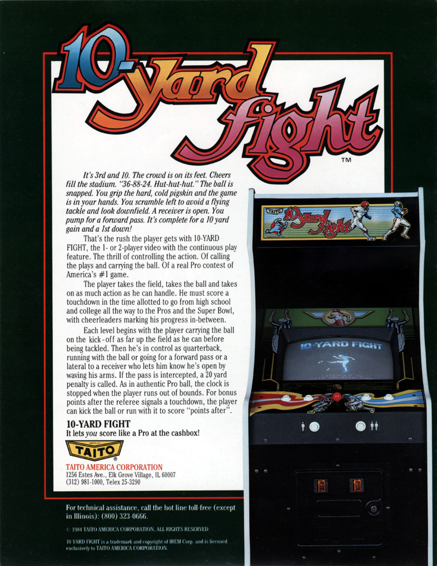 Here is a 10 Yard Fight arcade game for sale. This game was made by Taito in 1984.  In this arcade game, the player must score a touchdown in the time allotted to go from high school and college ball all the way to the Pros and the Super Bowl.