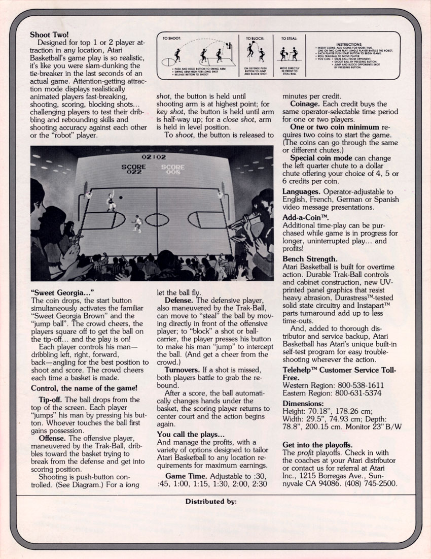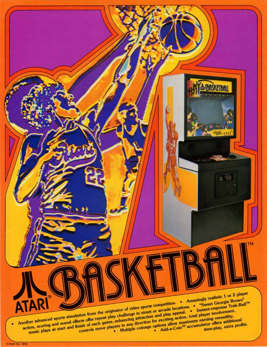One on one basketball between two players or one player and computer. Giant “Atari Trak Ball” (TM) and one button for control. “Sweet Georgia Brown” at tip-off. Crowd roars with every successful shot.