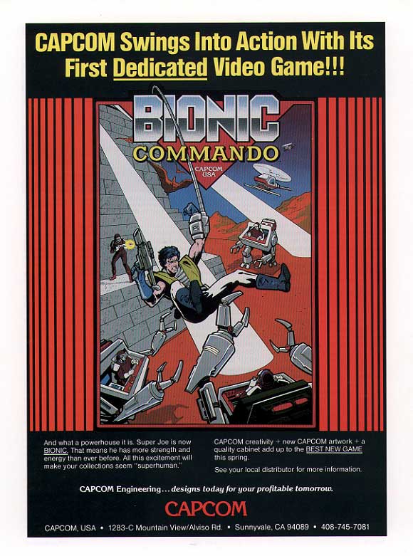 Vintage Arcade Superstore welcomes our customers to check out our Bionic Commando arcade game. You play the game as Super Joe from The Speed Rumbler. Use your bionic arm to climb through levels and shoot enemies. Collect parachuting weapons and bonus point items that fall from the sky. This game was also released under the name Top Secret.