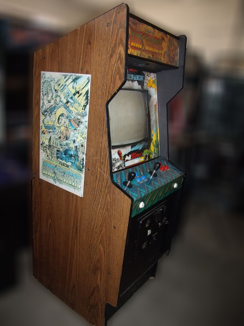 The Blood Brothers arcade game is now for sale at Vintage Arcade Superstore. The setting is the Wild West where the player moves a cross hairs and shoot at objects on a stationary screen. The player character can duck and roll along a one dimensional plane. A boss must be defeated before advancing to the next level.  The game play is similar to their earlier game Cabal.  This game was made by Tad Corporation and licensed to Fabtek.  Note: This game was only sold as a conversion and will be in a nice generic arcade cabinet.