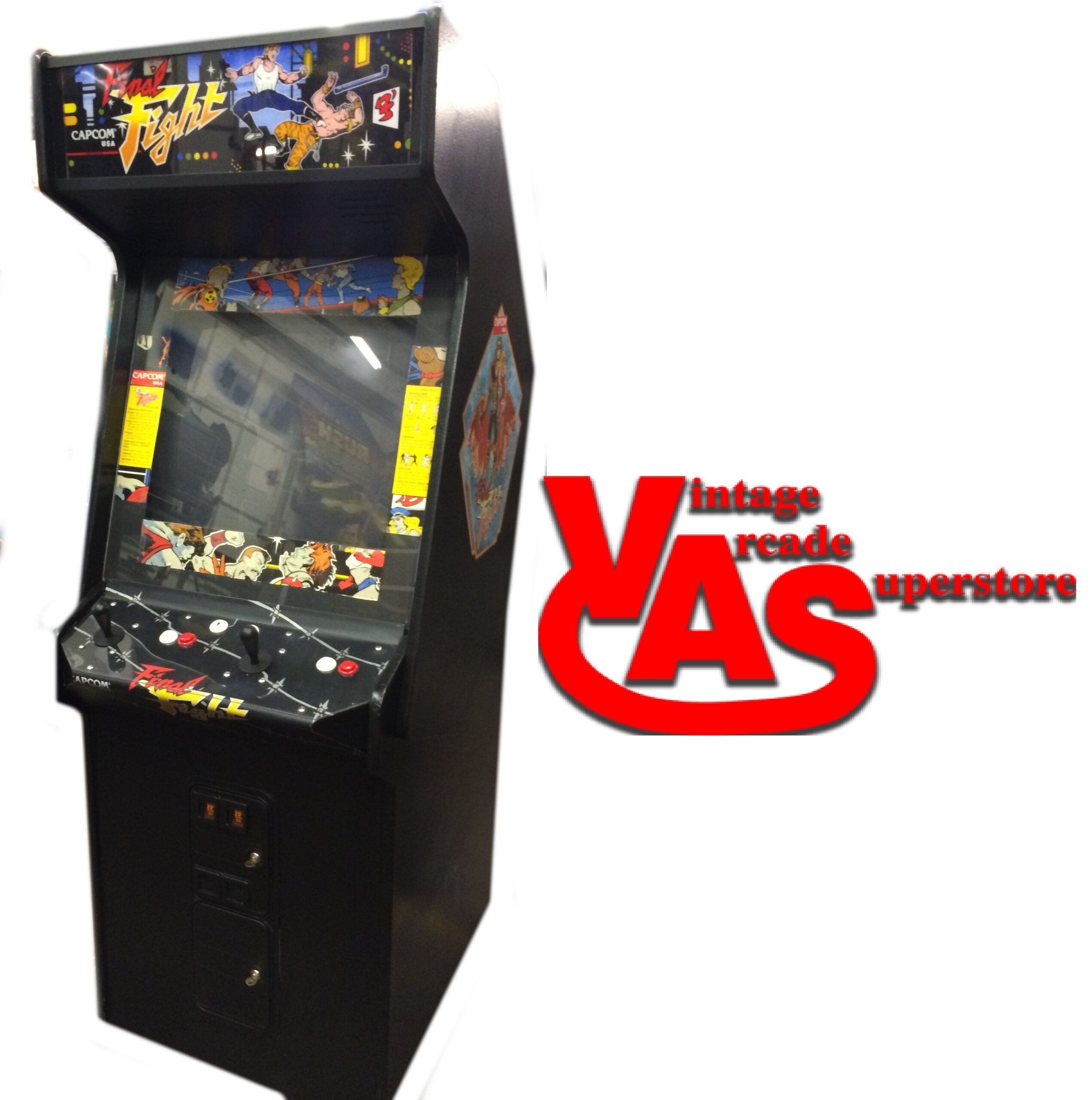 Here’s a Final Fight Arcade game for sale by Capcom. In this classic side scrolling beat’em up game, you play as Haggar and Cody. Haggar is the mayor of the city of the bay city and his daughter gets kidnapped by the evil group called the Made Gear, so it’s up to you Haggar and Cody who is also the boyfriend of Haggar’s daughter go to rescue her and also including Guy a ninjitsu fighter who is a friend of Cody. This Capcom Arcade game has a Jamma harness and it is among a popular title in the arcades.
