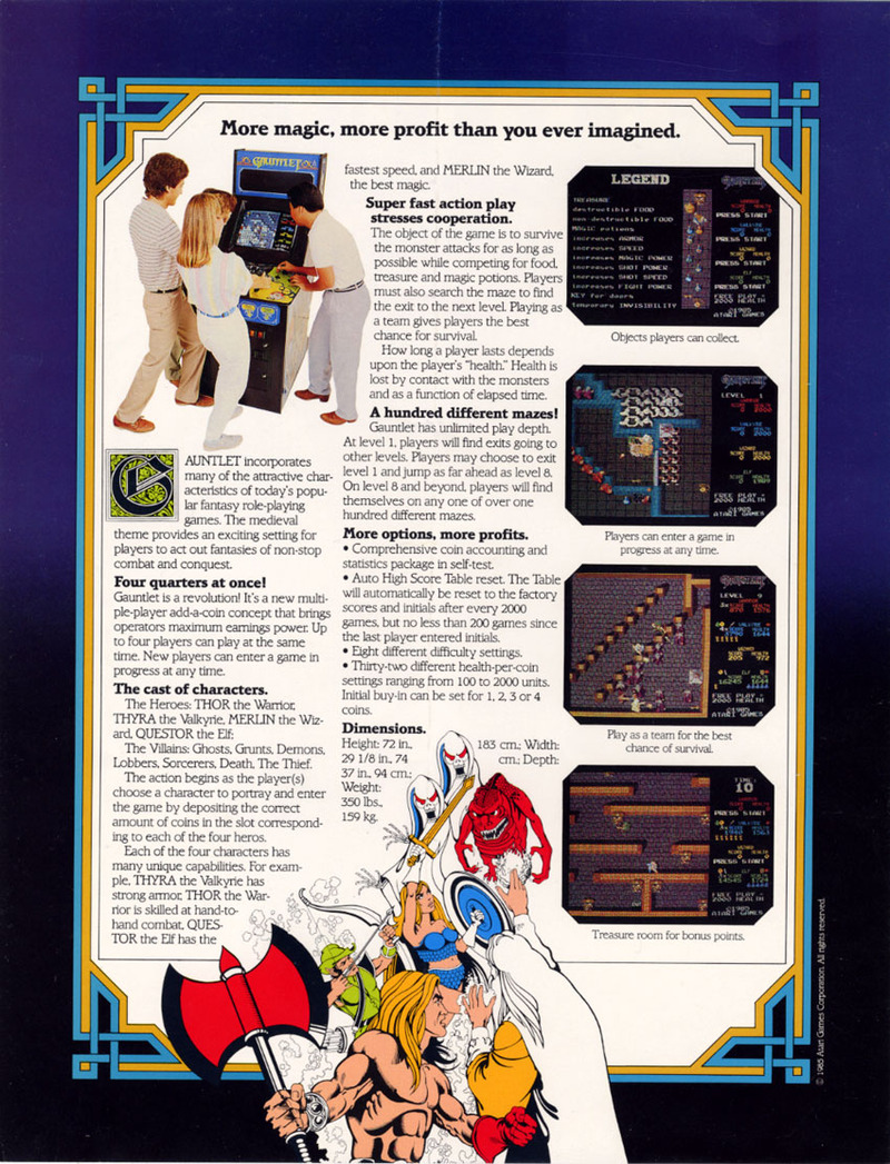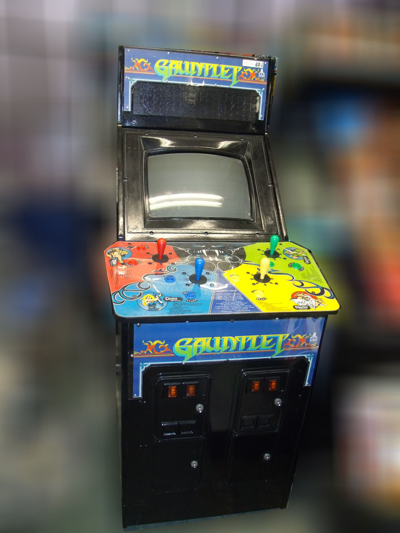 Navigate with through mazes teeming with ghosts, demons, and treasure in this classic dungeon crawl arcade game. Released in 1985 by Atari, Gauntlet was one of the first four player arcade games of it’s kind. The players choose which of the four characters they wish to play: The Warrior, The Wizard, The Valkyrie, or The Elf. Each character has different strengths and weaknesses and players can cooperate to successfully clear each level. Enemies drain a player’s health, but it also drains slowly on it’s own giving each level a time limit. Each player has a joystick and two buttons, one to fire or fight enemies, and the other to use magic. Food can be picked up to restore health, and potions can be picked up that will destroy all the enemies on the screen. This classic game comes in the original cabinet with original control panel, marquee, and side art and a 19 inch CRT monitor. We can fully restore this classic with all new artwork. Does the original cabinet not matter? We can retrofit the original Gauntlet circuit board into a larger cabinet, with a wider control panel for easier multiplayer use, and include the 25 inch CRT monitor upgrade for only $100 more!