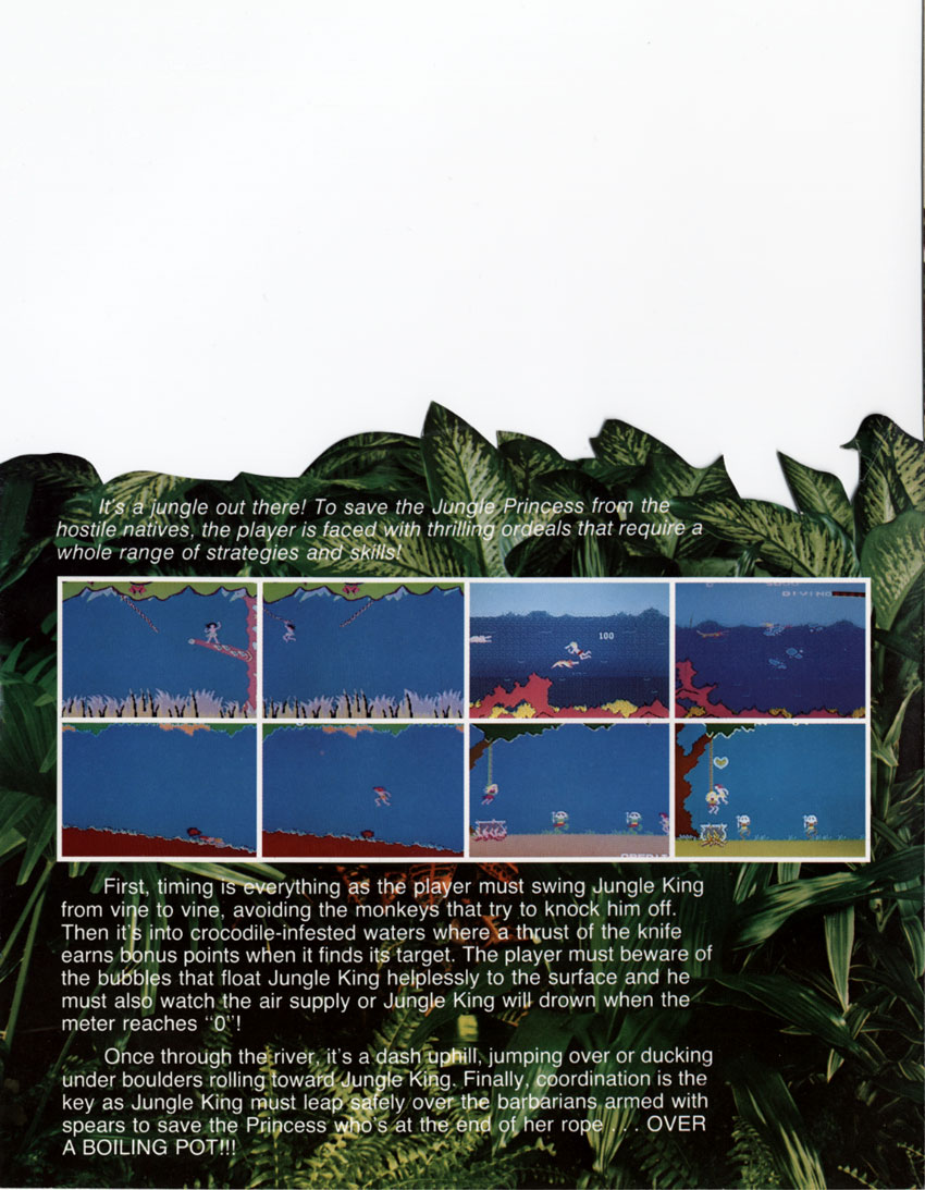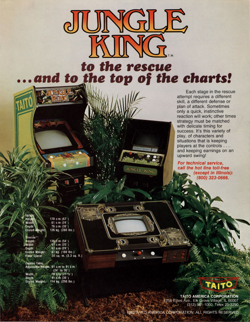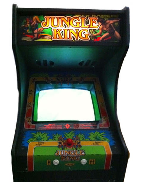 Here is a Jungle King Arcade game for sale.  This game features a Tarzan looking character going through 4 levels to save the girl. Taito later changed the game to Jungle Hunt.