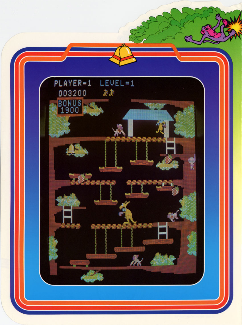 There are four different levels. The first level just has three floors connected to three long ladders. The second level is the same as the first except that on each floor, there are platforms that Mama Kangaroo must jump onto to get to each short ladder on each floor. On the third level, the cage in which Kid Kangaroo is imprisoned is held up by an entire stack of monkeys and there is an entire horde of apples that the monkey will unleash if five of them climb up there. During this level, Mama Kangaroo must punch each monkey in the stack several times until the cage is lowered and when the cage has been lowered enough, Mama must climb to the next floor to get to Kid Kangaroo before the cage is raised again or before the monkeys have the horde of apple cores unleashed. On the fourth level, there are odd connections of floors, platforms and ladders and the monkeys will throw apples and drop apple cores more unpredictably.