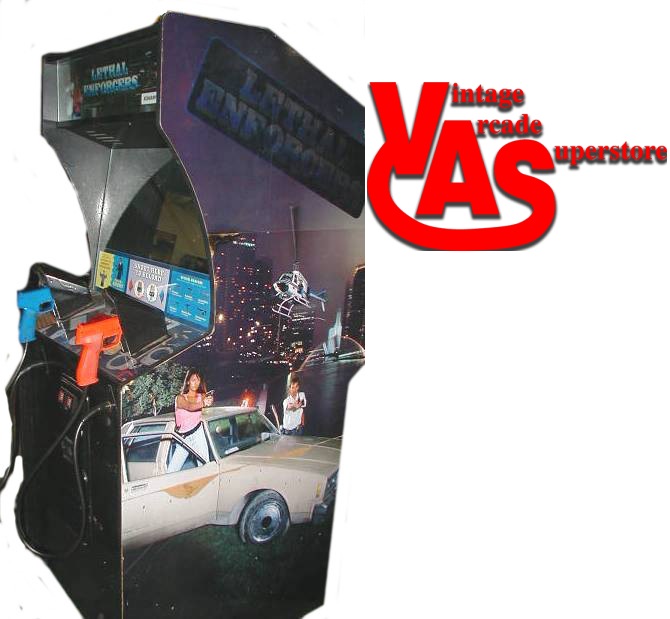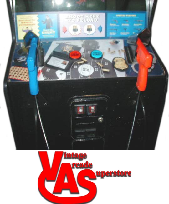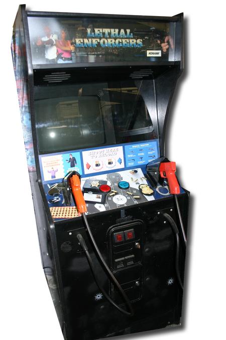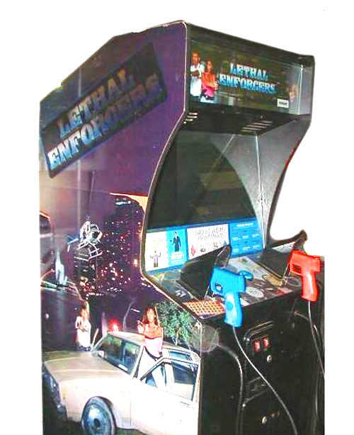 Here is a Lethal Enforcers Arcade game for sale. This was the first 2 player gun game where you can pick up the guns and shoot. This is the game that started the trend in the arcades for all the other 2 player gun games. The in game graphics consist entirely of digitized photographs. This caused controversy as it allowed players to shoot photorealistic representations of enemies. The photos below show the condition of how the game will come in.  You can save $300 if you get the game in a generic cabinet instead of the original cabinet.