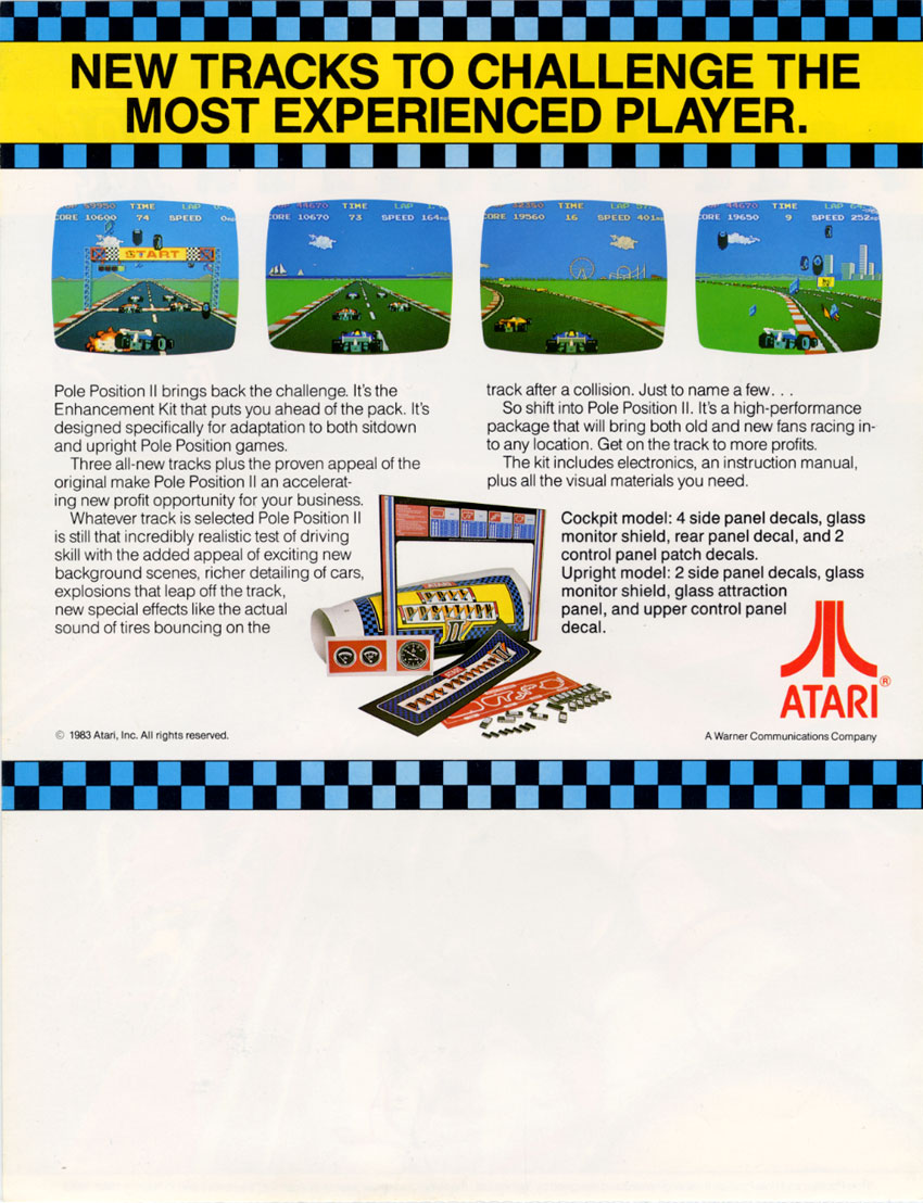 Pole Position 2 is an upgrade to the original Pole Position. It features 4 tracks, Fuji, Suzuka, Seaside, and Test. When the car crashes, you see your car explode.