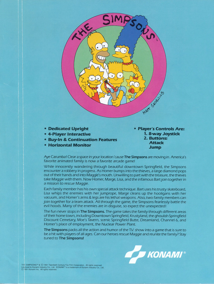 4-player co-op game where players assume the roles of Homer, Marge, Bart, or Lisa Simpson. Goal: save Maggie and recover the stolen diamond.