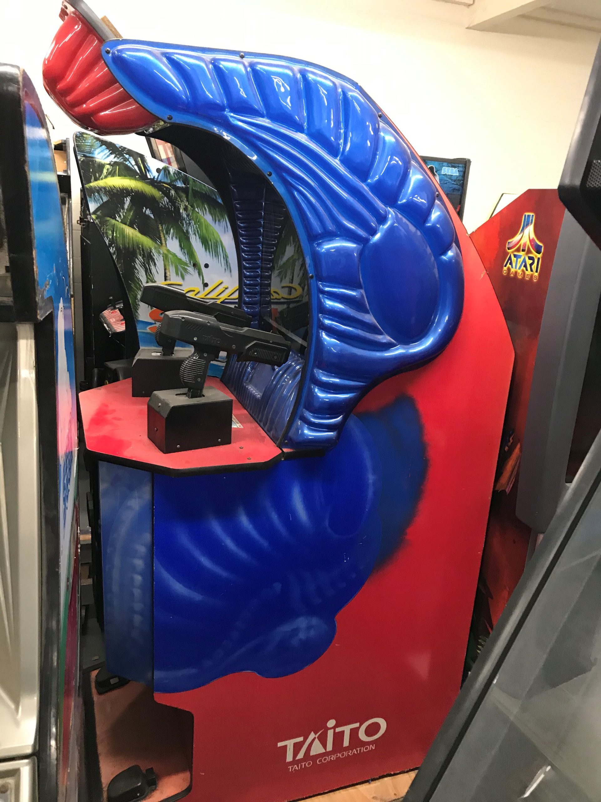 The cabinet is quite unique since the marquee looms out over the leaning players. The sides contain 3-D molded plastic decals which are blue in colour and resemble a large alien cocoon.