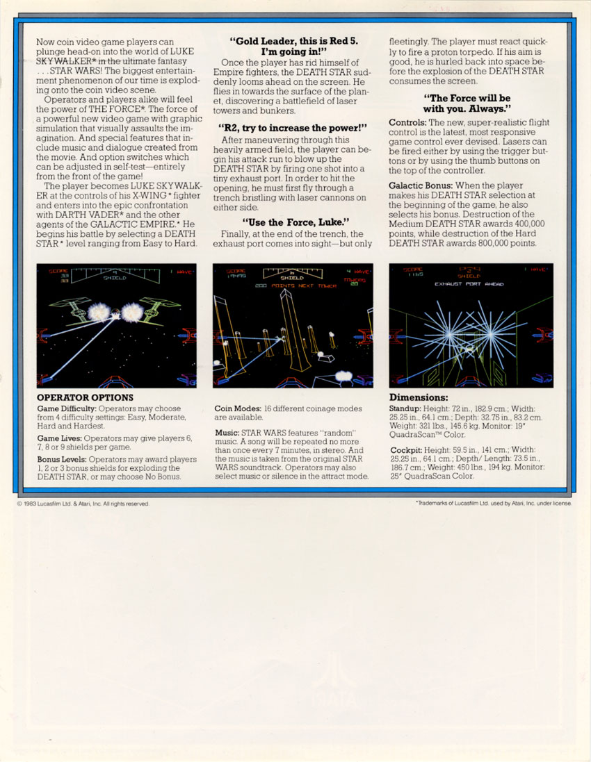This Atari arcade XY game came out in 1983. The game itself simulates the attack on the Death Star, simulated in first person point of view. The Star Wars arcade game was produced during It has amazing sound and speech effects for it’s time, including digital samples of the voices of actors from the movie. The sound files include the voices of James Earl Jones as Darth Vader, Harrison Ford as Han Solo, Mark Hamill as Luke Skywalker and several more.