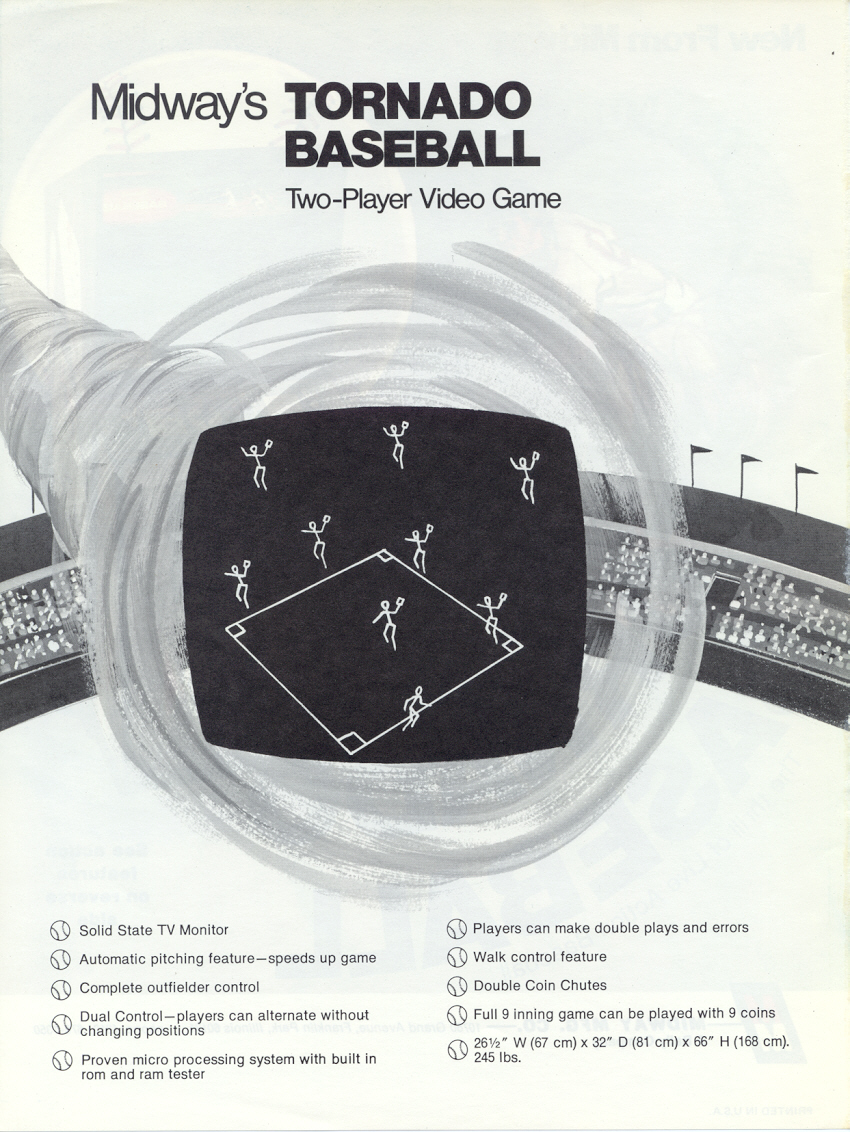 Tornado Baseball by Midway is an electro-mechanical arcade game where players hit pitched balls to score runs in a realistic baseball simulation.