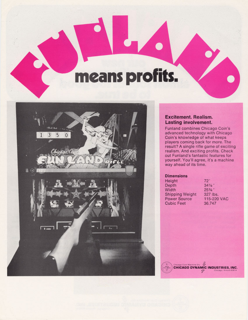 Cash Box Aug-31-1974 page 43 stated this game was “currently in production, with sample shipments enroute (sic) to ChiCoin distributors.” The manufacturer refers to this game as the one word “Funland” in the flyer and in magazine ads. However, the game is displayed on the backglass as “Fun Land Rifle”. Reportedly, this game did not come from the factory with an 8-track tape. The manufacturer’s flyer seems to obliquely indicate the buyer is to provide the tape(s) by stating, “that’s the kind of music you can provide.” |