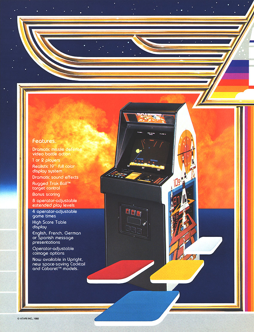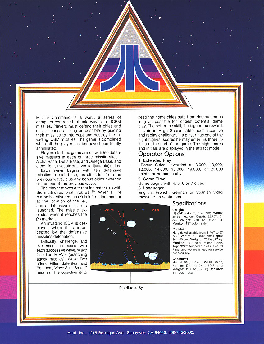 Using three atomic missile launching bases you defend your cities against incoming missiles. Enemy missiles may seperate into several missiles so shoot them down early because you only have a limited number of missiles.