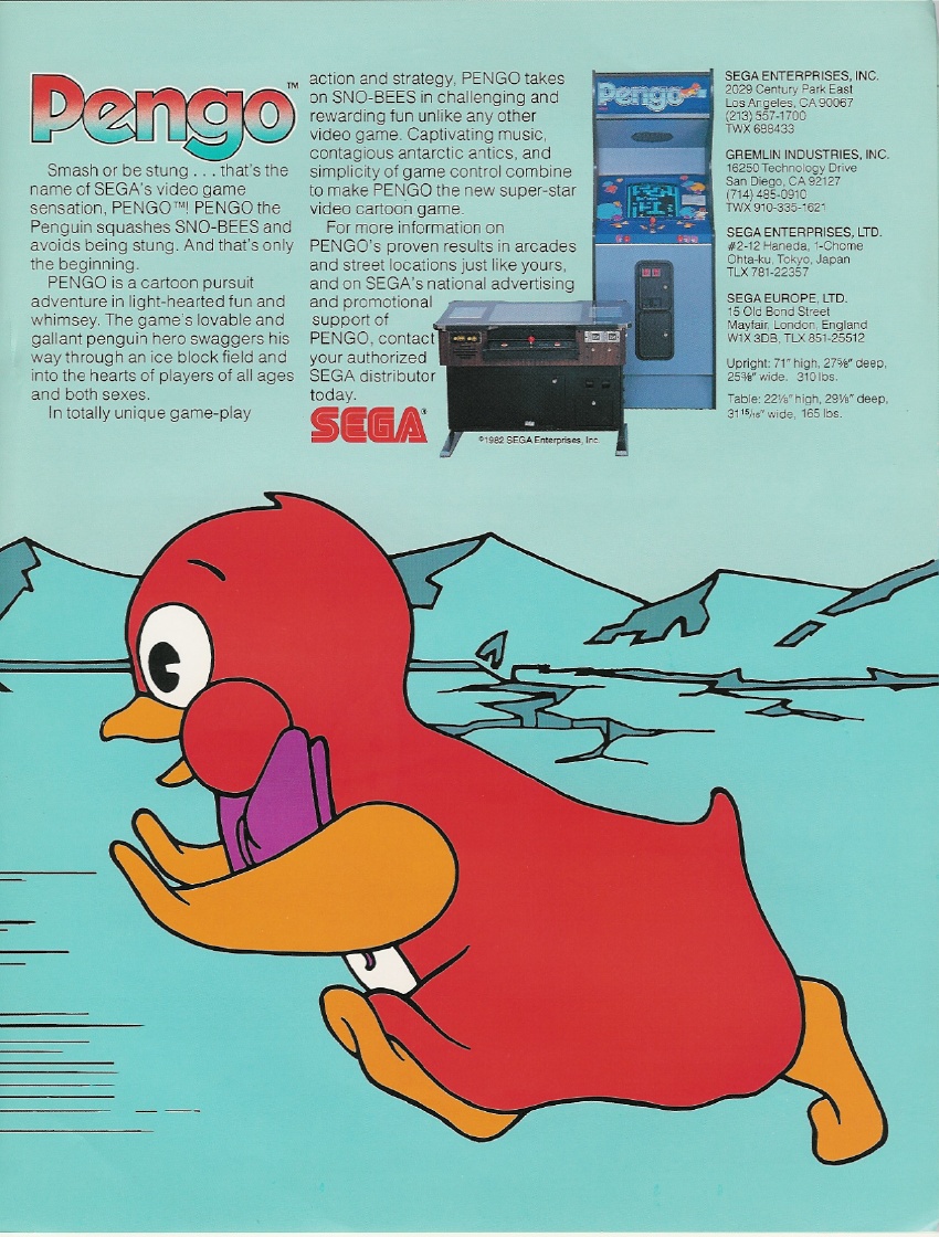 In Pengo you are a penguin in a maze of ice-blocks. Slide the blocks to squash the Sno-Bees chasing you or electrocute them by trapping them along a wall. Score 10,000 points for aligning three special diamond blocks. You get bonus points are awarded for finishing a level quickly.