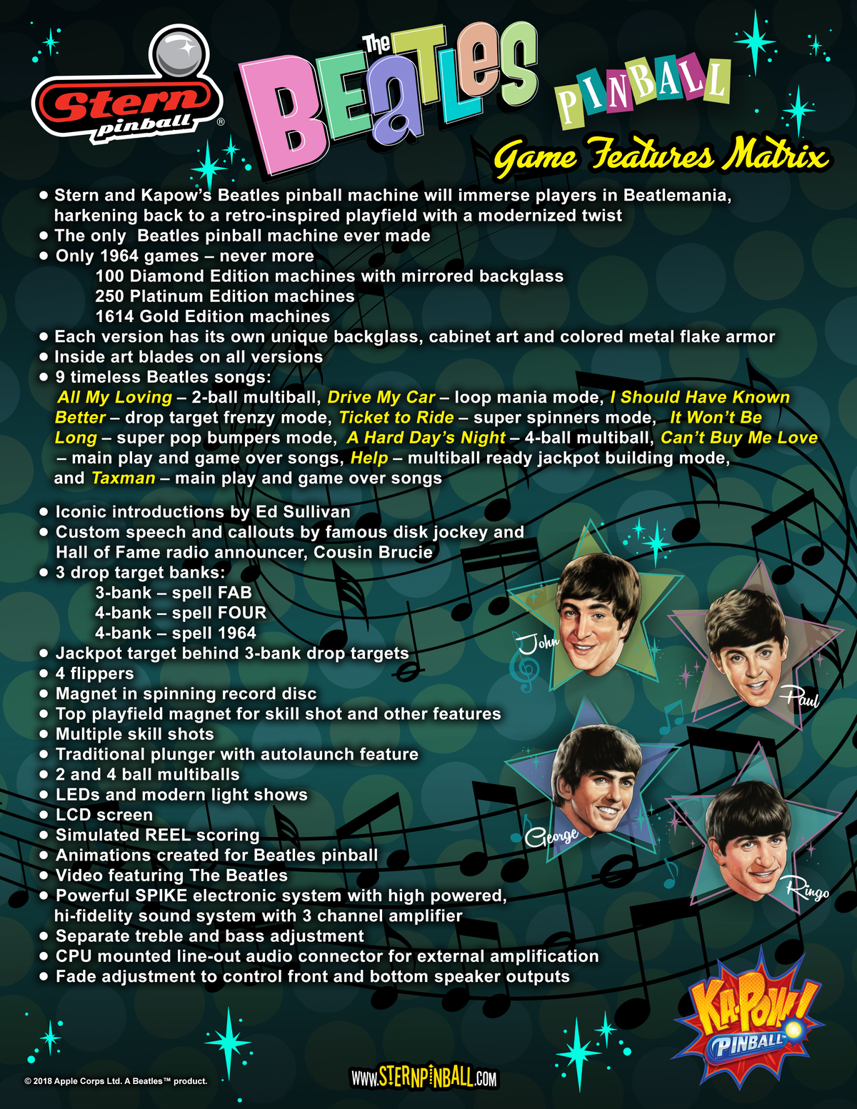 Stern advertised this Gold Edition as having a production run of 1,614 units. This unusual quantity, when added to the 250 units made of the Platinum Edition and the 100 units made for the Diamond Edition. Totals 1,964 units produced, representing the year (1964) that The Beatles were introduced to the United States on the Ed Sullivan TV show. |