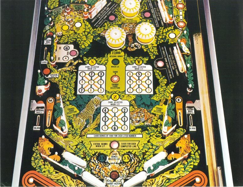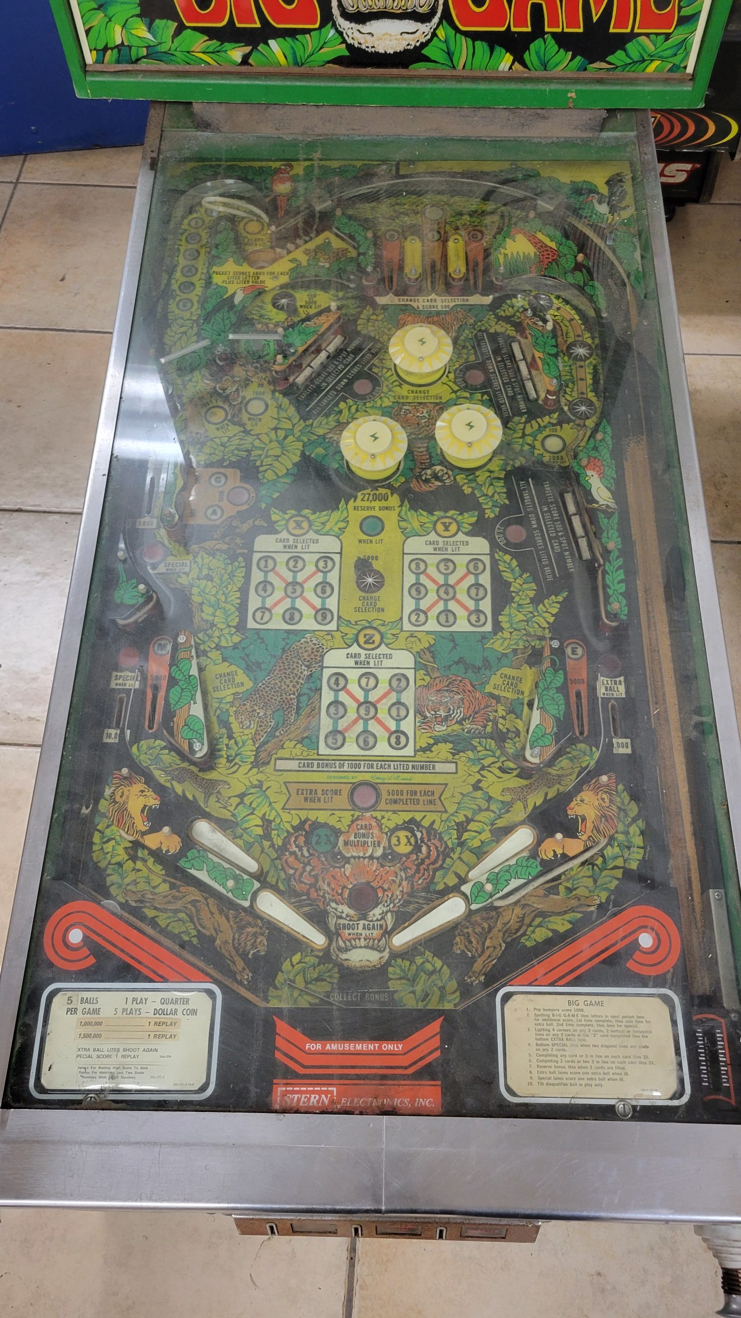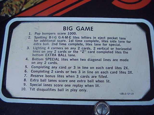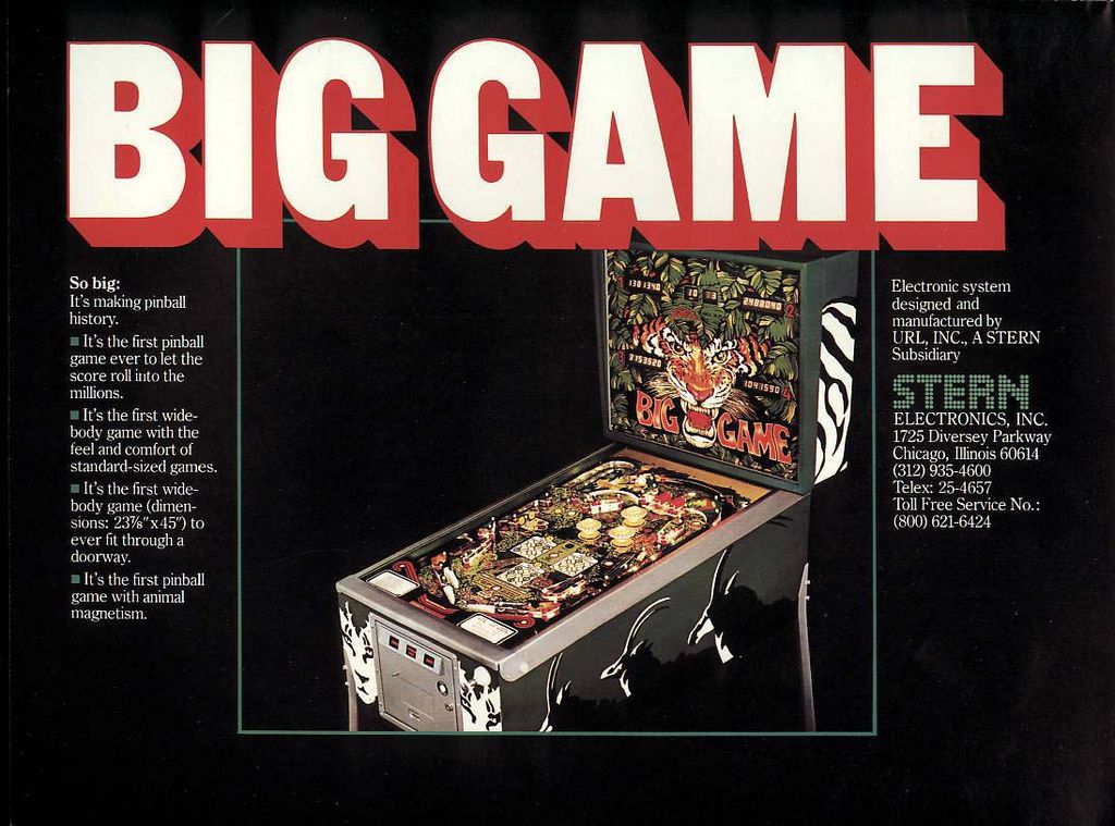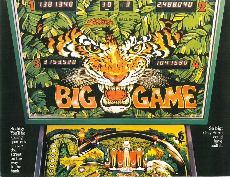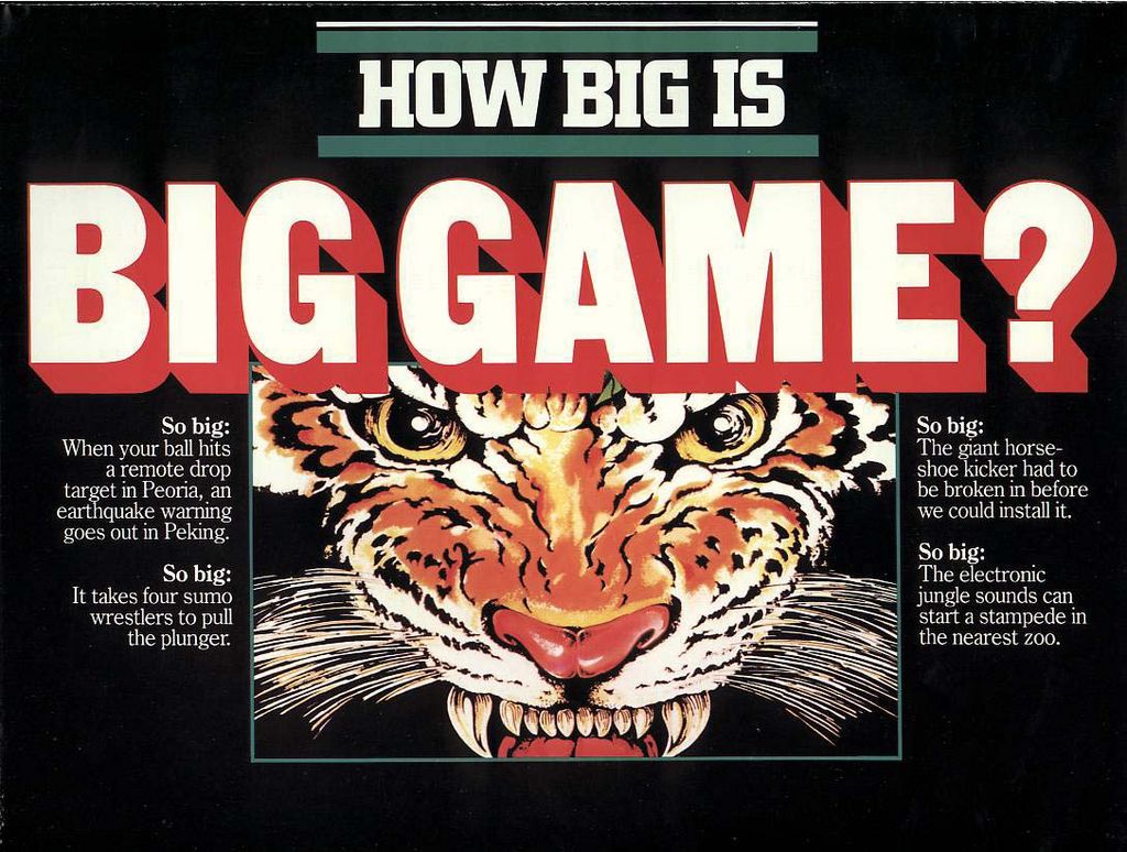It was also the first electronic pinball to use 7-digit score displays. To advertise this, all four score displays simultaneously animate the numbers “1234567” during Game Over mode, followed by flashing “7777777” for three seconds, repeating it again after displaying high scores. There are no added sounds during this animation. According to an article in Amusement Review (Jan/Feb 1980, page 6), Stern was “prototyping models with both the traditional and a new plastic playfield.” We have not seen the plastic playfield for this game, if any still exist. Manufacturer data for Big Game: |