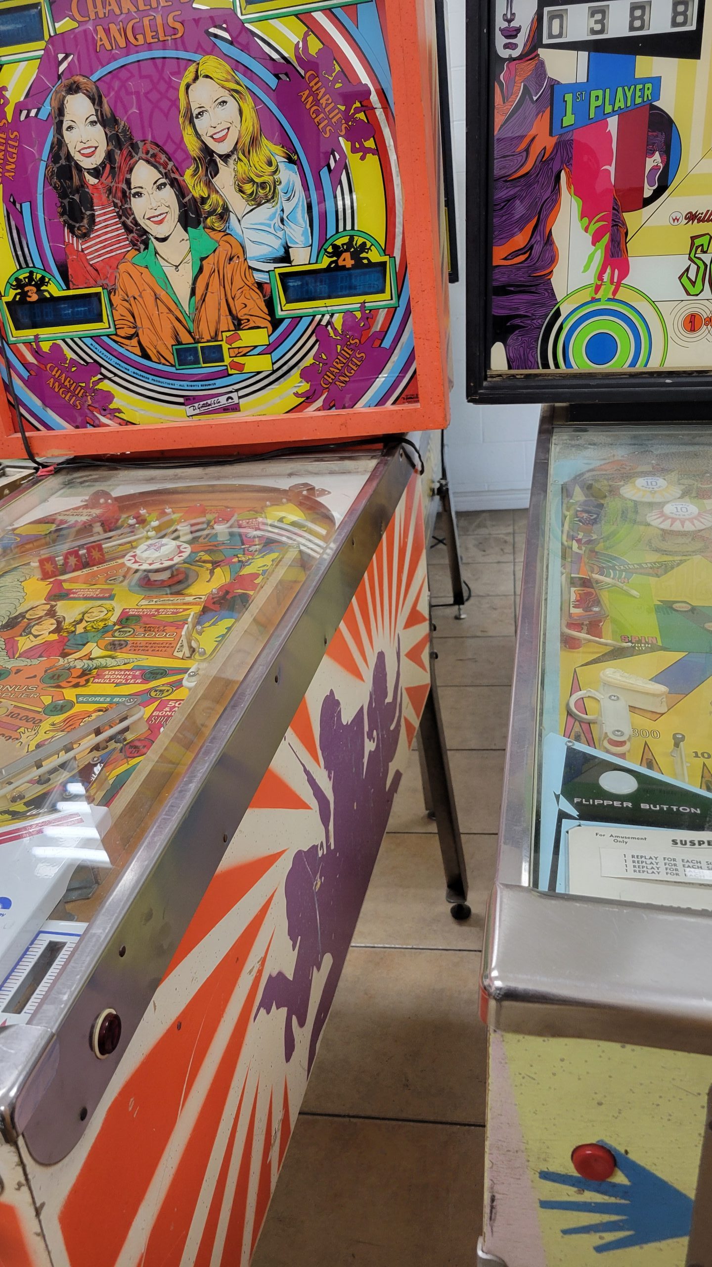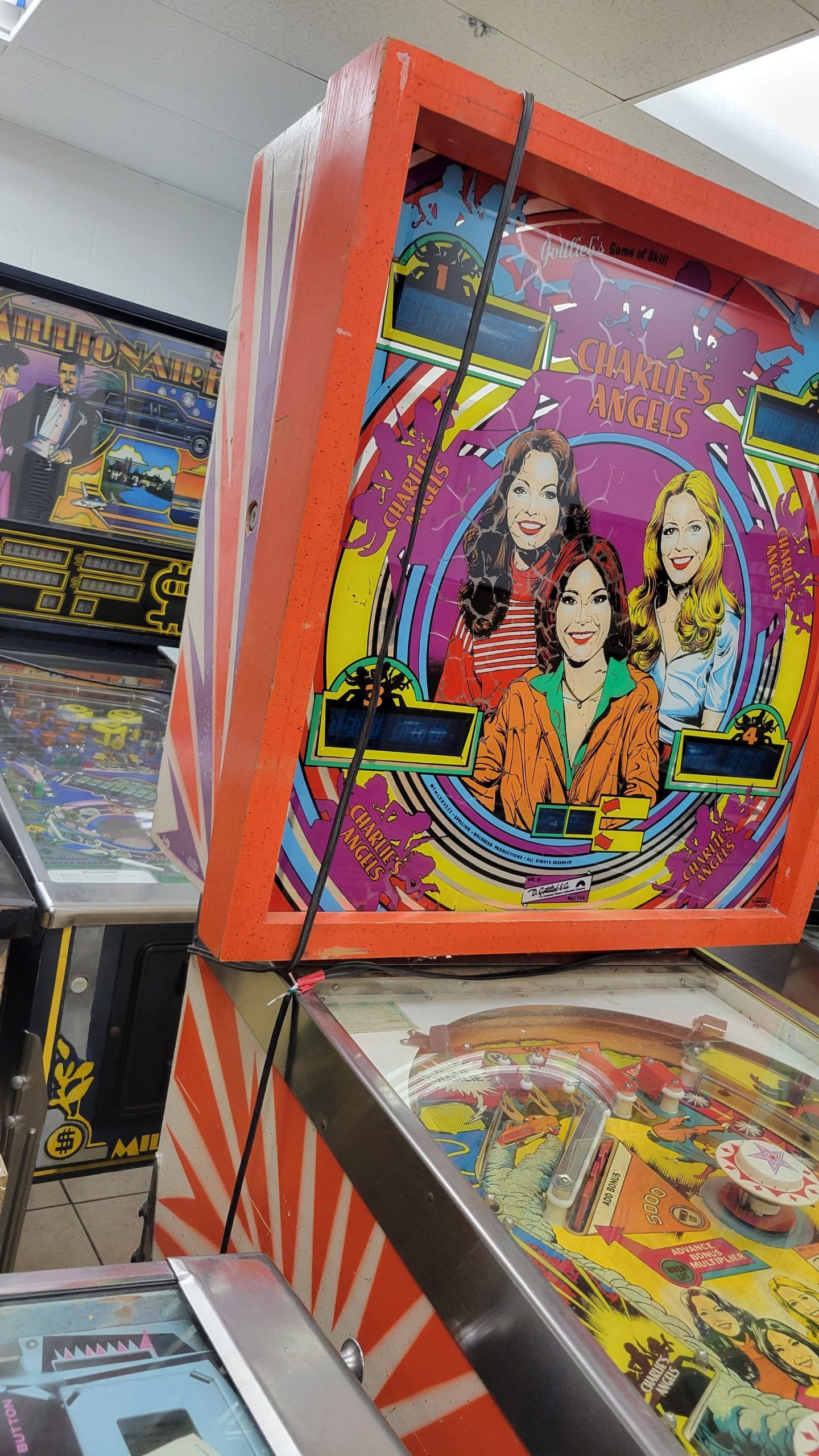 Charlie’s Angels Pinball featured the likenesses of Jaclyn Smith, Kate Jackson, and Cheryl Ladd is on Sale! This game is at a reduced price because the playfield has a lot of wear on it.