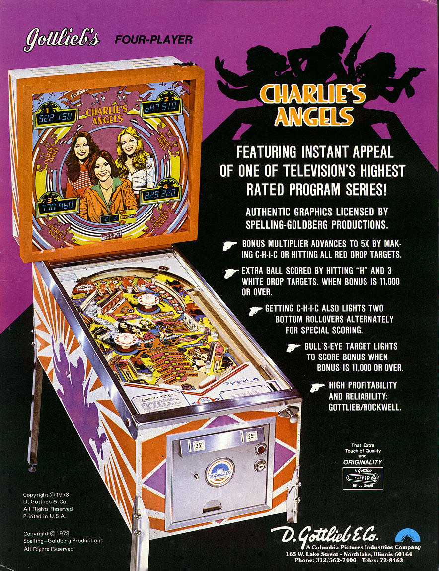 Notes: ‘Charlie’s Angels’ was produced in both 7,600 electronic and 350 electromechanical versions. It featured the likenesses of Jaclyn Smith, Kate Jackson, and Cheryl Ladd, from the 1970’s TV show.