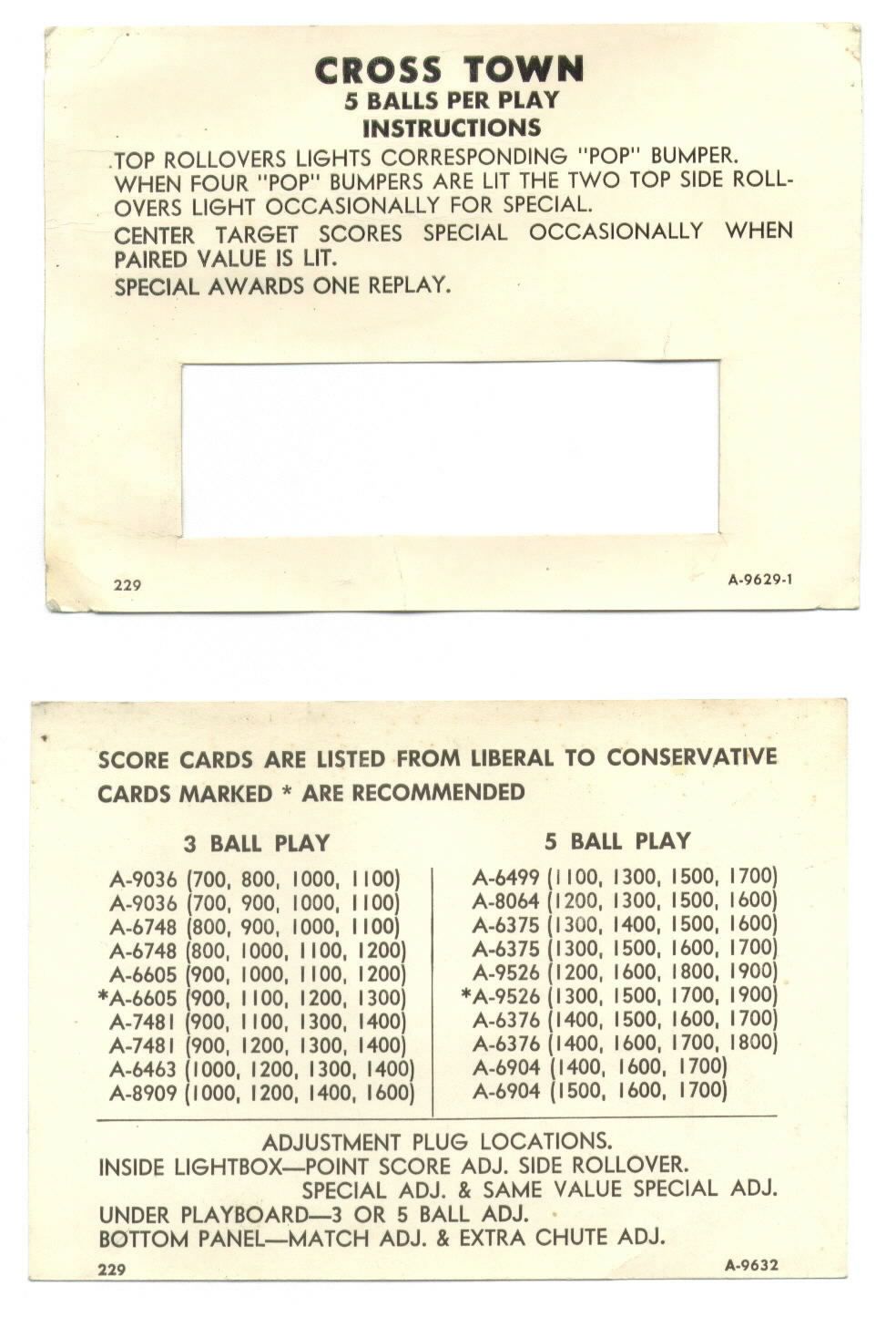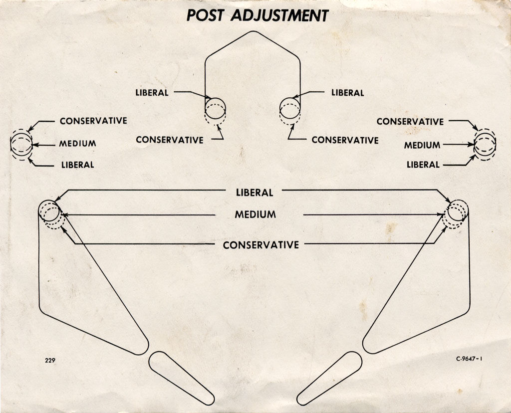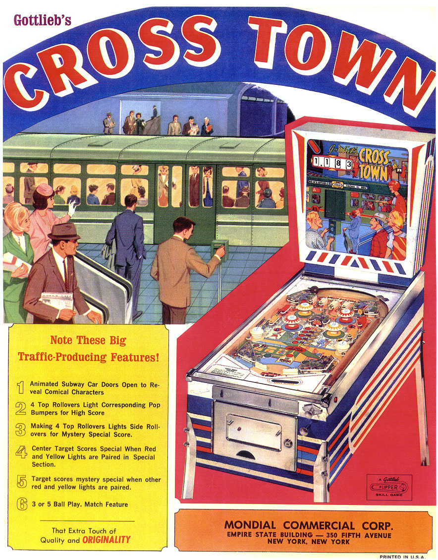 | Notable Features: | Flippers (2), Pop bumpers (4), Passive bumpers (2), Slingshots (2), Standup targets (3), and Rollunder (1). Mechanical backbox animation (subway doors open) and Wide flipper gap. Center target scores 10 points or paired point value, with paired point values sometimes awarding a Special instead of points, on a random basis. Lighting all pop bumpers lights upper side rollovers on an occasional basis for Special. The normally-dark ball guides adjacent to these rollovers will light to indicate the Special. Backglass has a ‘Last Ball in Play’ light. 3 or 5 ball play.