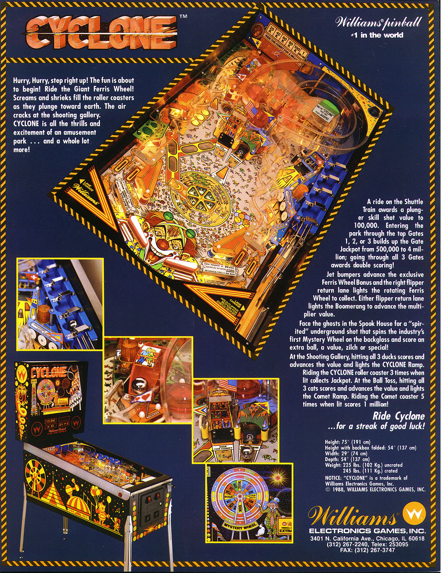 | Marketing Slogans: | “Ride Cyclone … for a streak of good luck!” “It’ll blow you away!” “From the most powerful force in the pinball universe. Feel it and be awed!” |