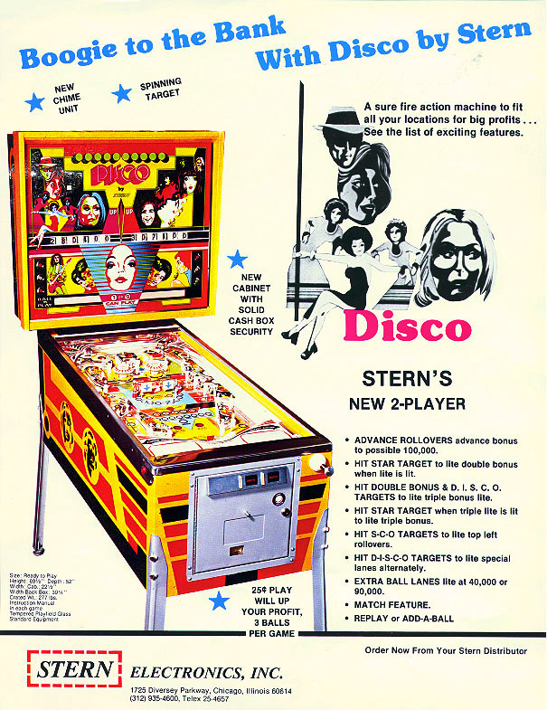 Stern Electronics releases Disco in June 1977 as a two-player electro-mechanical pinball machine featuring swinging bumpers, a playfield spinner, and colorful disco-era artwork celebrating music and dance culture.