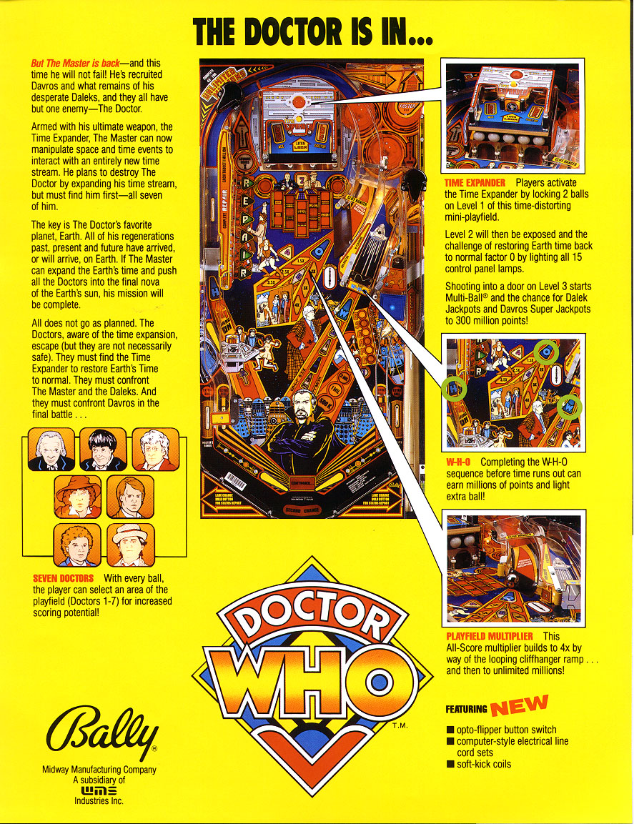 | Notable Features: | Flippers (3), Pop bumpers (3), Slingshots (2), Standup targets (13), Flyaway targets (3), Kick-out holes (2), 6-bank drop targets (1), Ramps (2), Multiball. The Time Expander mini-playfield raises and lowers during play: It its lowest position (Level 1), the kick-out holes are accessible. In its middle-position (Level 2), five round white standup targets are accessible, and when in its upper position (Level 3), three flyaway targets are accessible. Dalek backbox topper lights up (and its head moves from side to side on some games. See Notes below).
