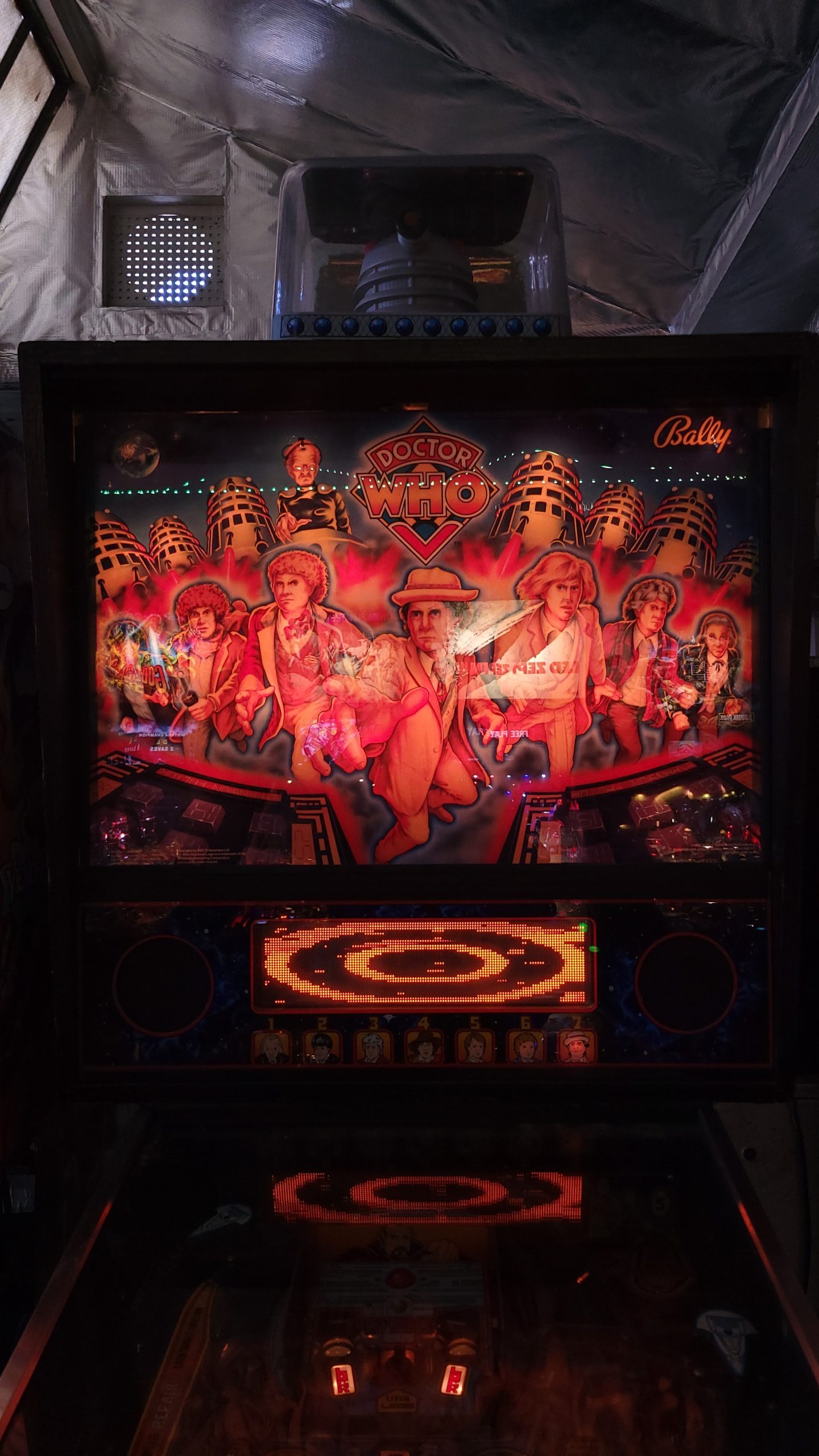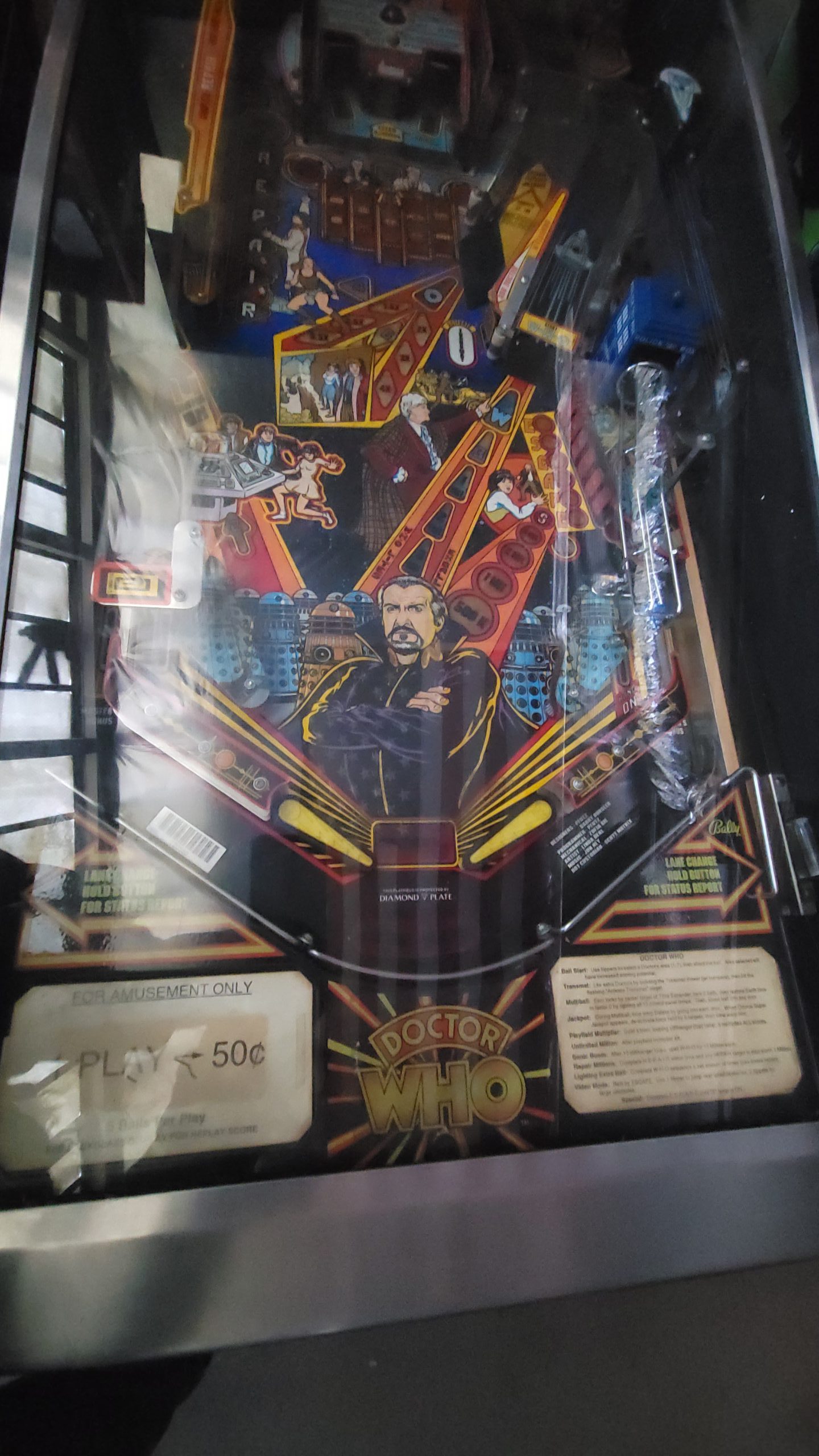 Designer Bill Pfutzenreuter told us that about a dozen (or less) sample games were made. Then followed by approximately 100 prototype games, before regular production began. Up to this point in manufacture, the Dalek head in the backbox topper moved from side to side.