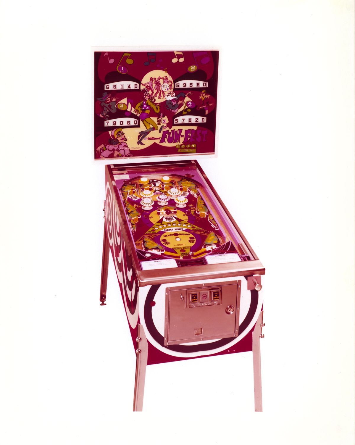 Williams’ Fun‑Fest from 1973 is a fast‑playing, electro‑mechanical four‑player pinball machine featuring swinging targets, pop‑up posts, vivid ’70s park‑themed art by Christian Marche, and lively action thanks to five DC bumpers and jumbo flippers