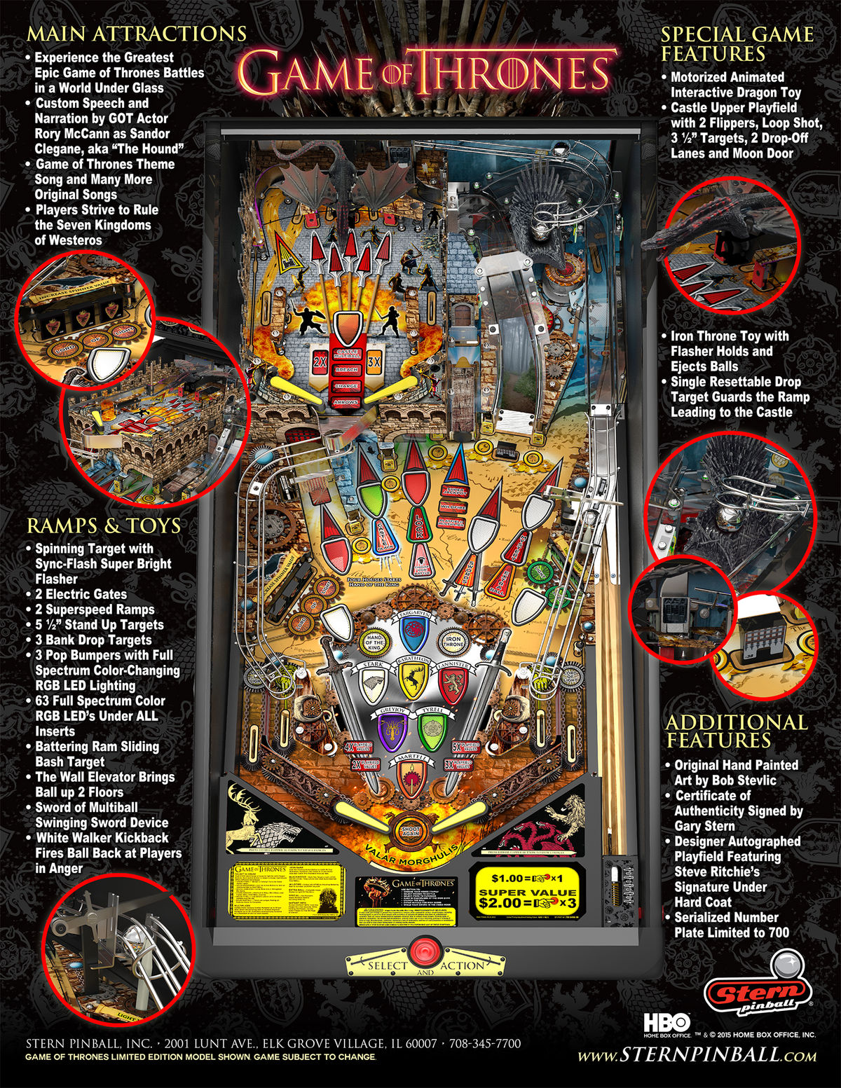 Flippers (4), Pop bumpers (3), Slingshots (2), Standup targets (11), Electric gates, (2), 3-bank drop targets (1), Solitary drop target (1), Spinning target (1), Diverter (1), Dragon kicker, Sliding bash target, Sword-shaped ball multiball release, Ball elevator. Elevated mini-playfield. Player control button on lockdown bar. 3-channel Bass + Stereo Hi-Fi sound system. Speech.