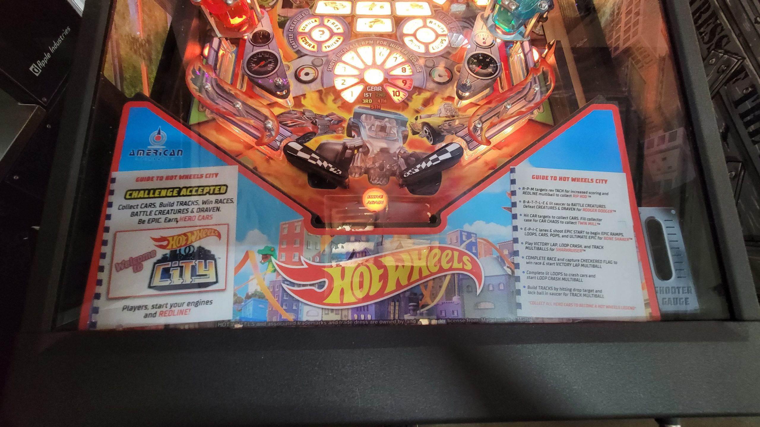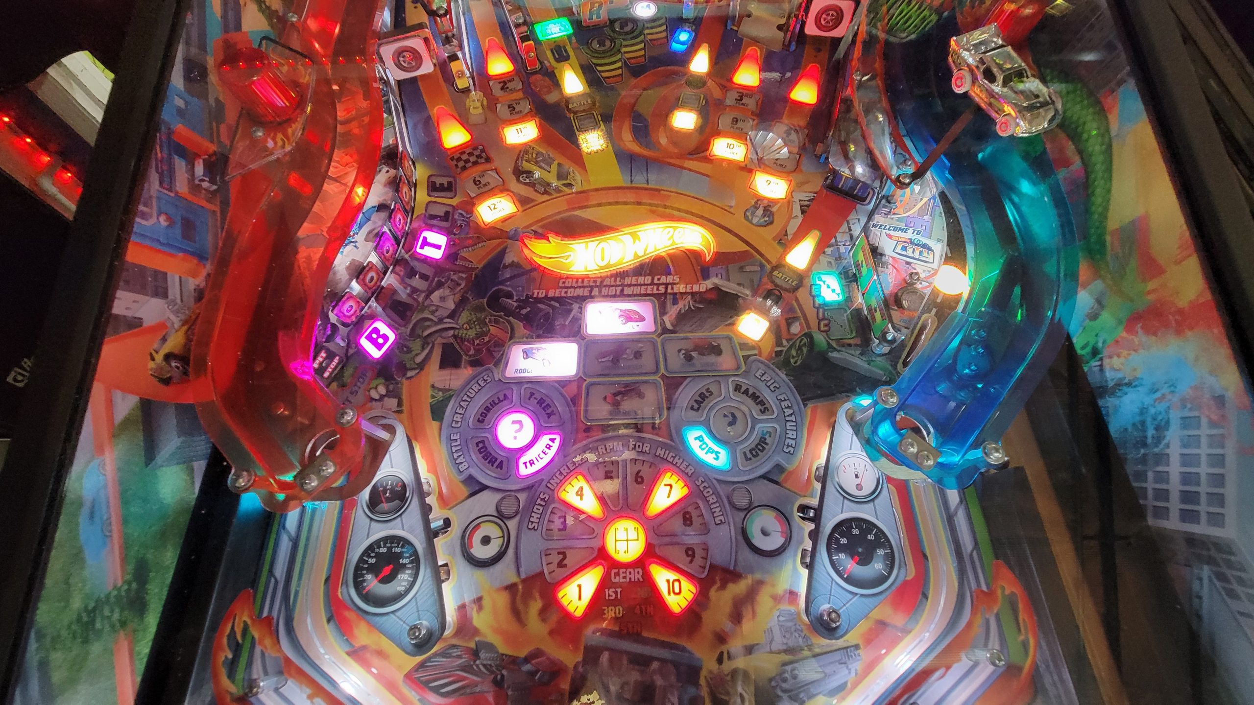 | Toys: | Five Hot Wheels cars, one spins interactively high above playfield Two flags on top of pop bumpers |