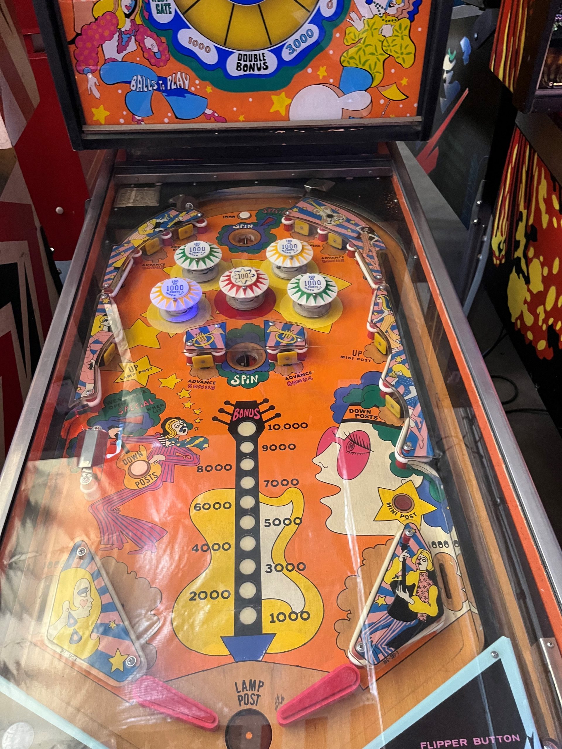 Manufacturer:Williams Electronics, Incorporated (1967-1985) [Trade Name: Williams]Date Of Manufacture:April 29, 1970Model Number:380Type:Electro-mechanical (EM) [?]Production:2,100 units   (confirmed)Serial Number Database:View at The Internet Pinball Serial Number Database (IPSND.net)  (External site)Theme:Music – SingingSpecialty:Mechanical Backbox Animation [?]Notable Features:Flippers (2), Pop bumpers (5), Slingshots (2), Standup targets (9), Kick-out holes (2), Rollover buttons (2). Mini-rollover button (1). Up-post between flippers. Left drop lane with detour gate. Right outlane has a mini-postPlunger skill shotMechanical backbox animation (arrow spins). The backbox spinner, not the outhole, scores the bonus ladder.Design by:Norm ClarkArt by:Christian MarcheNotes:The Add-a-ball version of this game is Williams’ 1970 ‘Rock ‘N Roll’.