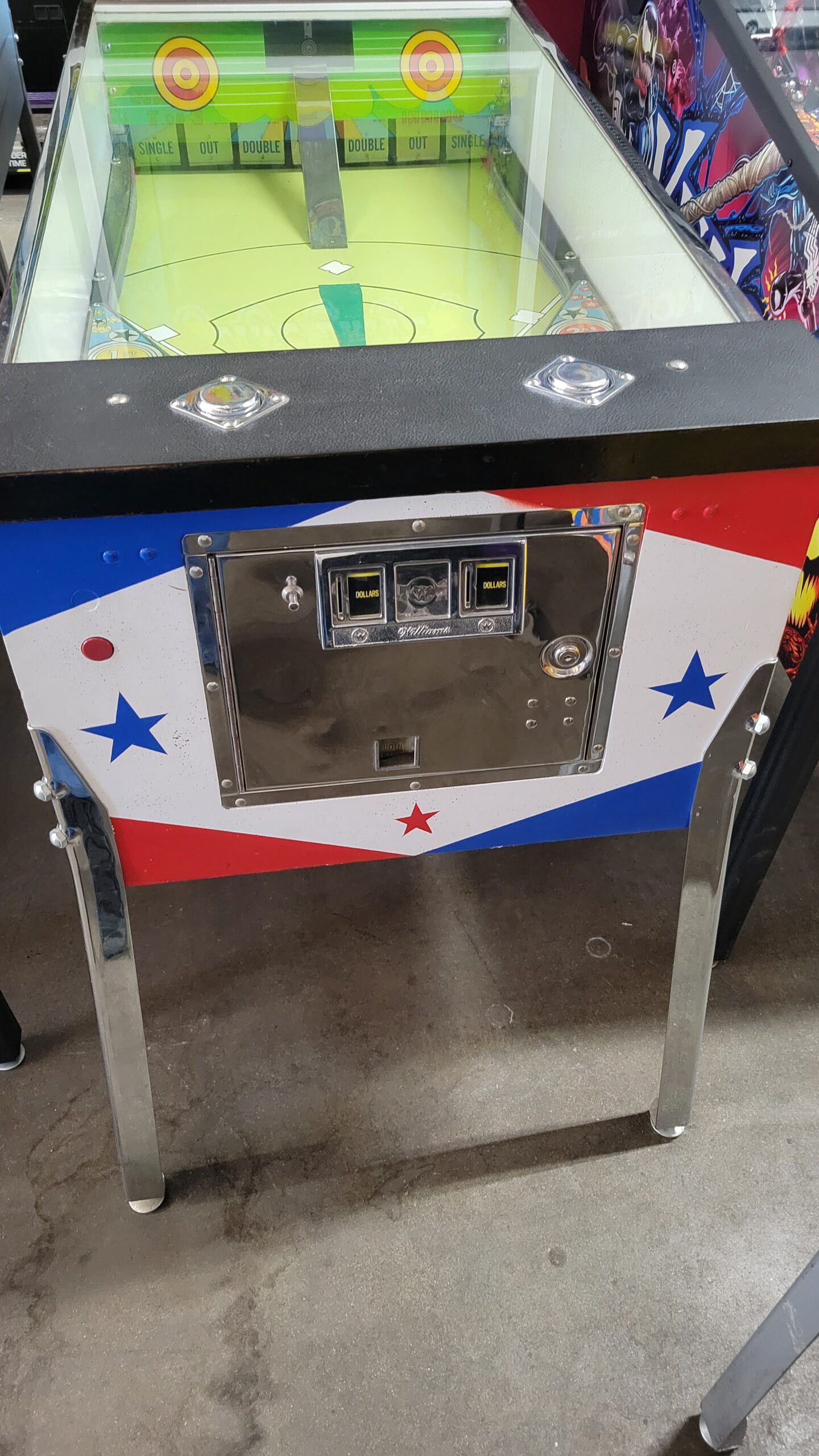 | Notable Features: | 3 outs per inning. 1, 2, or 3 innings per game (operator adjustable). Hanging targets (8). Center ramp delivers ball to hanging target for Bull’s Eye Grand Slam. Mechanical backbox animation (men run bases). | |||