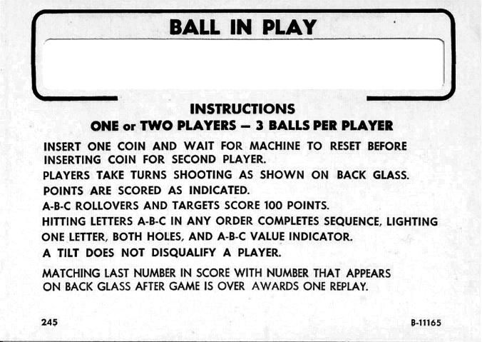 | Notable Features: | Flippers (6), Pop bumpers (3), Slingshots (2), Standup targets (7), Kick-out holes (2), Rollunder (1), Left and right dual outlanes. The A-B-C targets carry-over from player to player. | |||