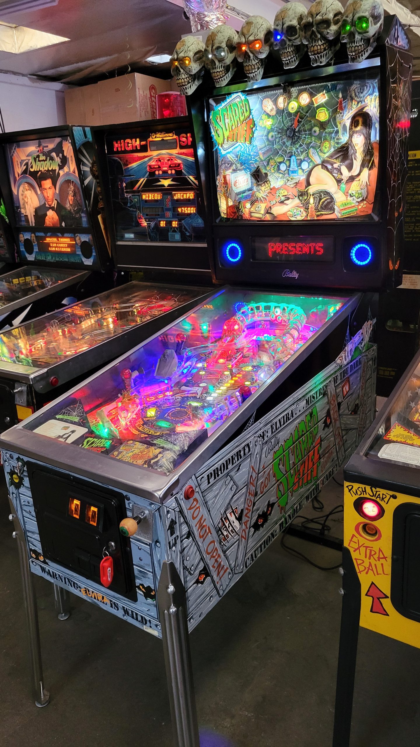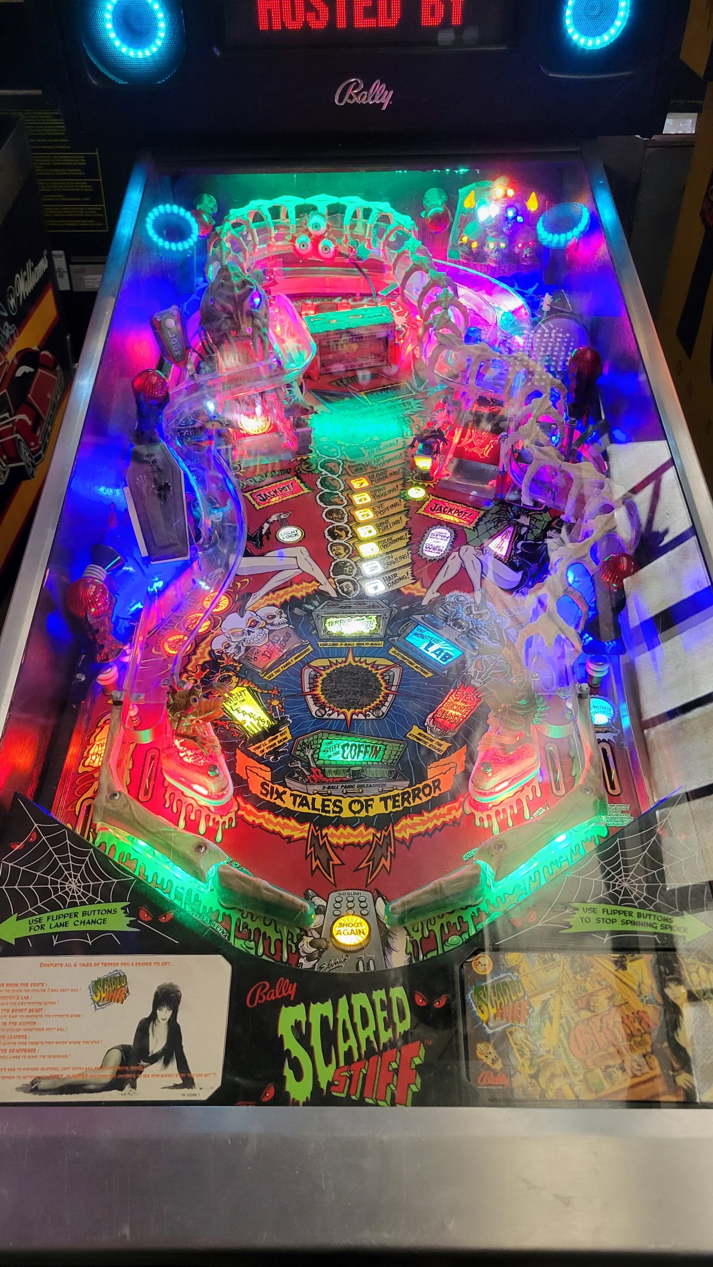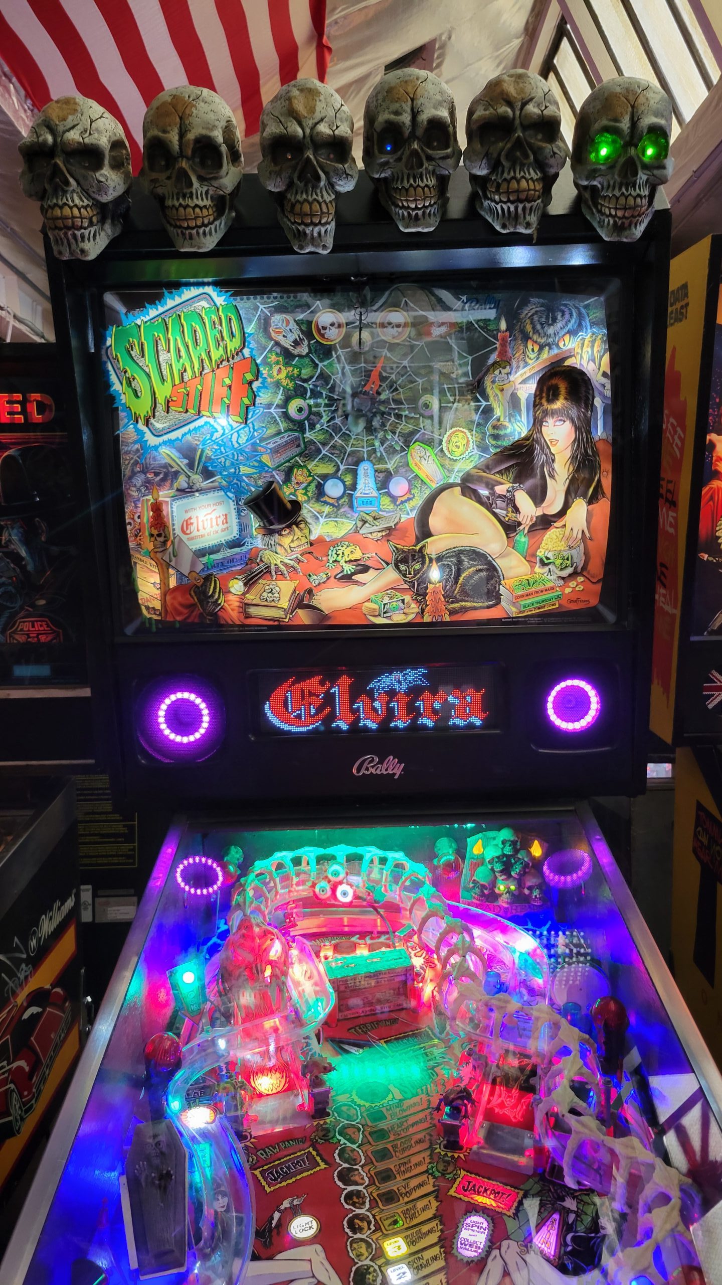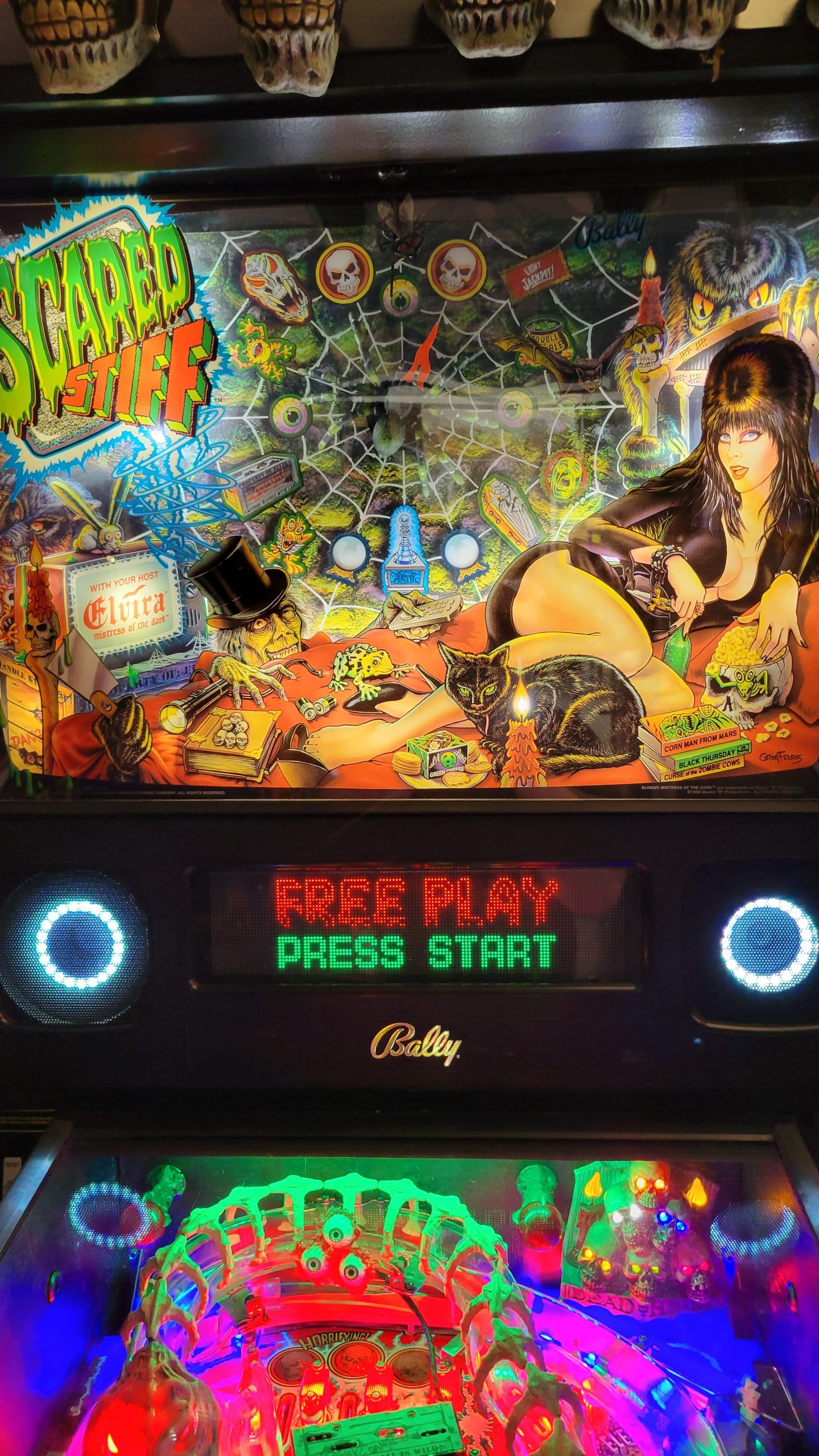 *This Scared Stiff has a LED Skull topper, LED implemented throughout the playfield, LED Speakers, and an upgraded Color Dot Matrix Display*