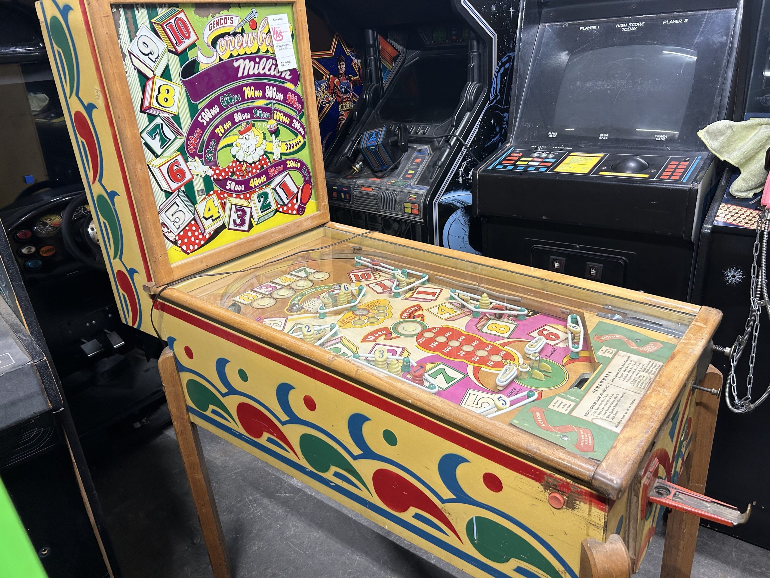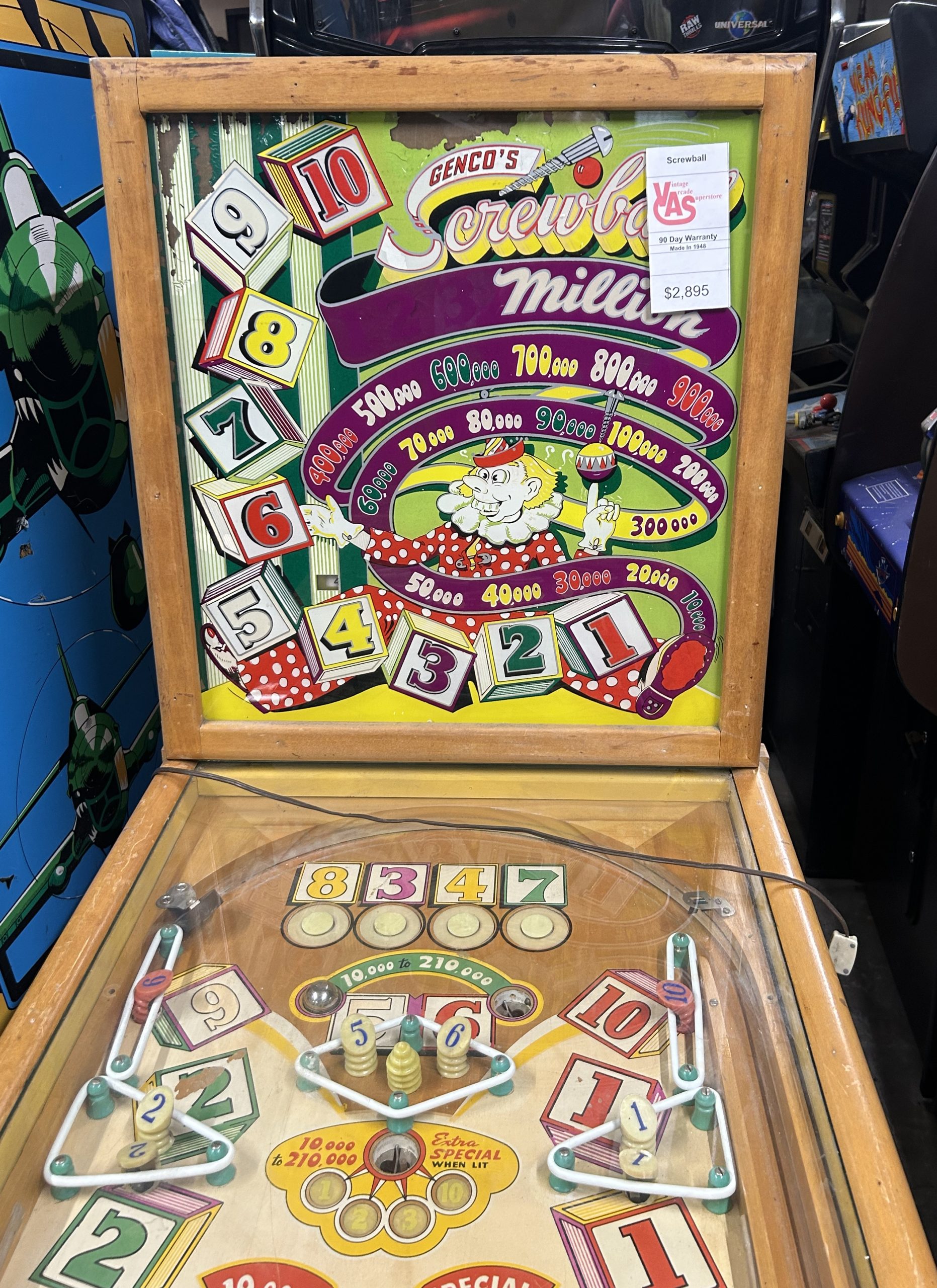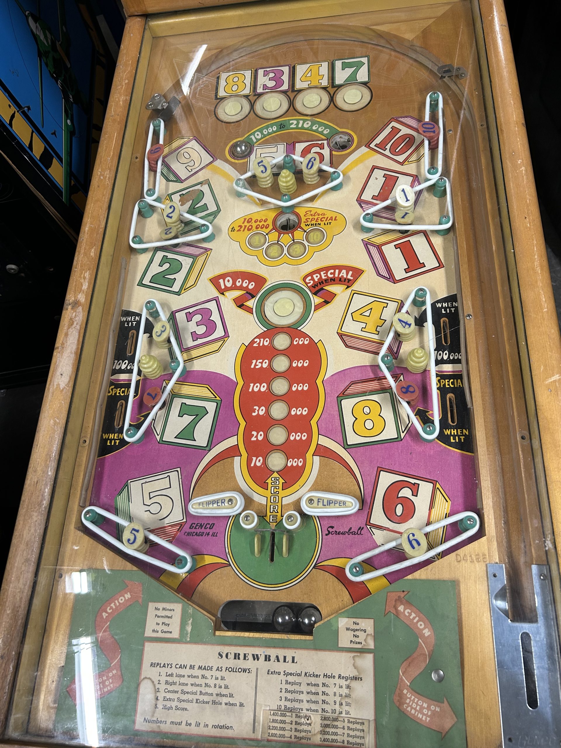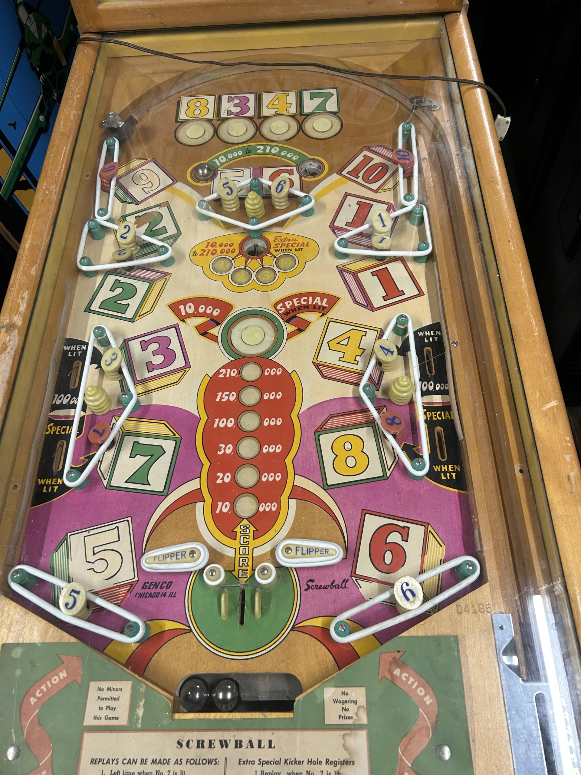 This game is a very antique pinball machine. It has wooden legs and side rails. The flippers are reversed. This was made before they figure out to put the flippers in the direction that they are today.