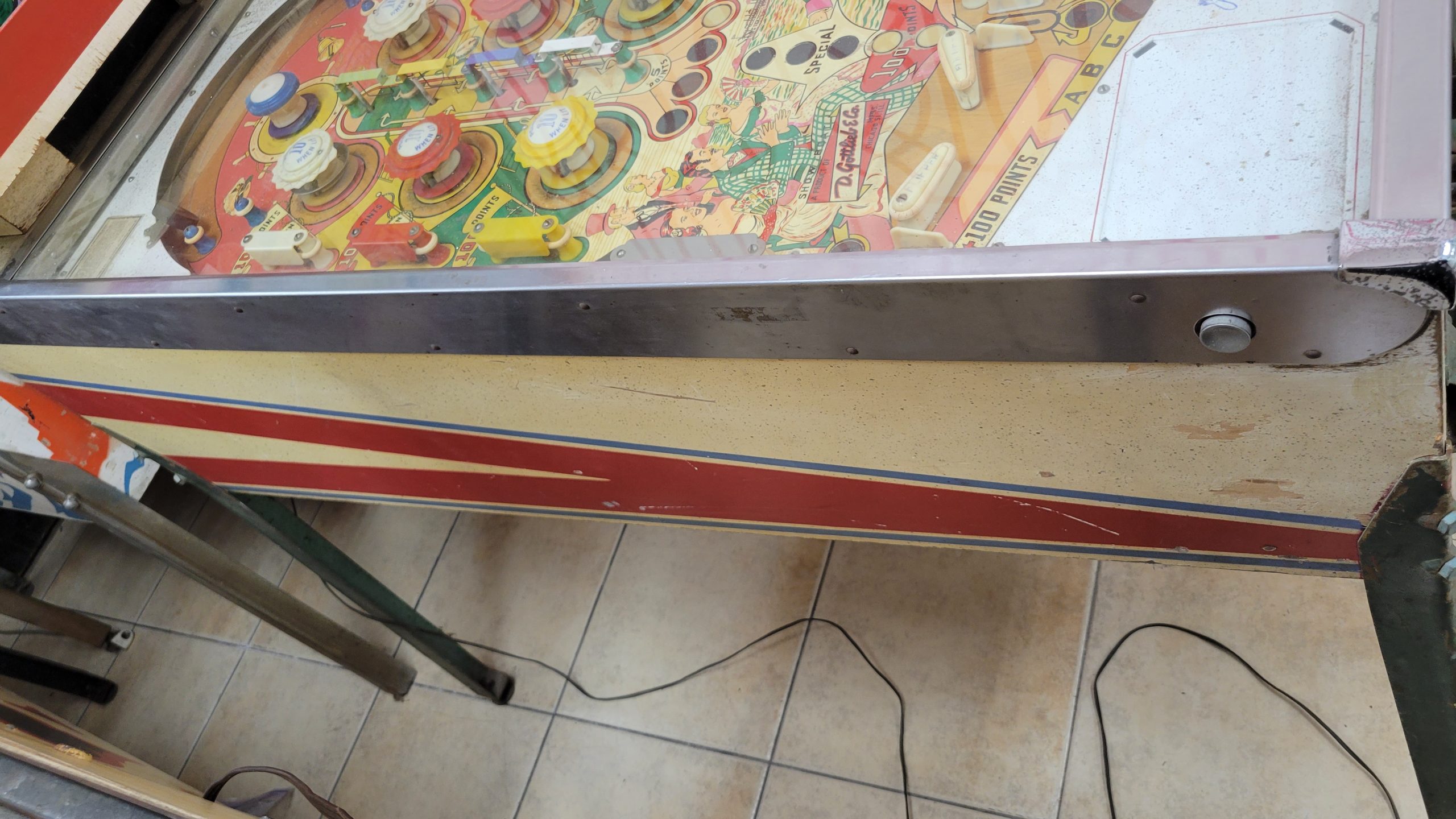 | Notable Features: | Flippers (4), Pop bumpers (6), Passive bumper (1), Rollunders (4). The left flipper button operates the left-side pair of flippers. The right flipper button operates the right-side pair of flippers. Scoring A-B-C will light a second match number to appear at end of game. Backglass has a “Score To Beat” window allowing the operator to place a card behind the backglass showing a suggested high score visible to the player.