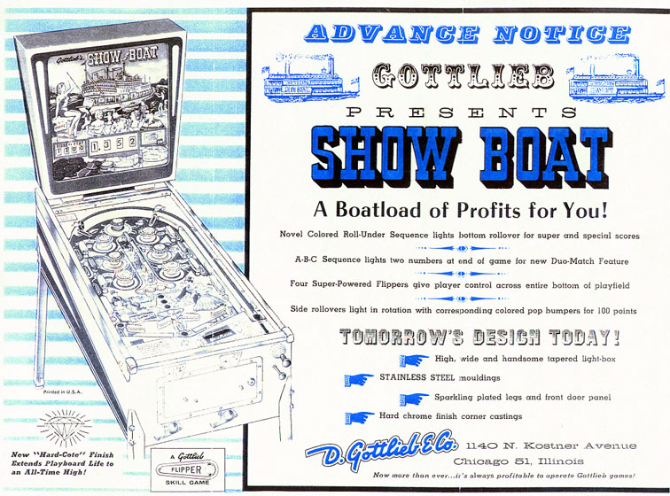 We previously showed a date for this game of March 1961. The new date is per Gottlieb documentation. Based on Edna Ferber’s 1926 novel of the same name, Show Boat has been on Broadway and film several times each from 1927 to 1994. |
