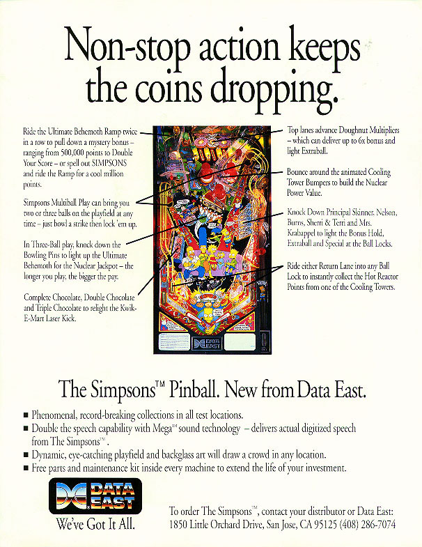 | Notes: | Joe Kaminkow told us that ‘The Simpsons’ was supposed to be their first game to have a dot matrix display (DMD). However, President and CEO Joe Keenan worried that development of the DMD might not be ready in time for this game. And then, problems occurring had they rushed it into production could put the company out of business. Also, Their next production game, Data East’s 1991 ‘Checkpoint’, introduced the DMD to pinball machines. Notes: We previously listed the Manufacture Date as October, 1990. However, this game was produced from September 1990 to February 1991. |