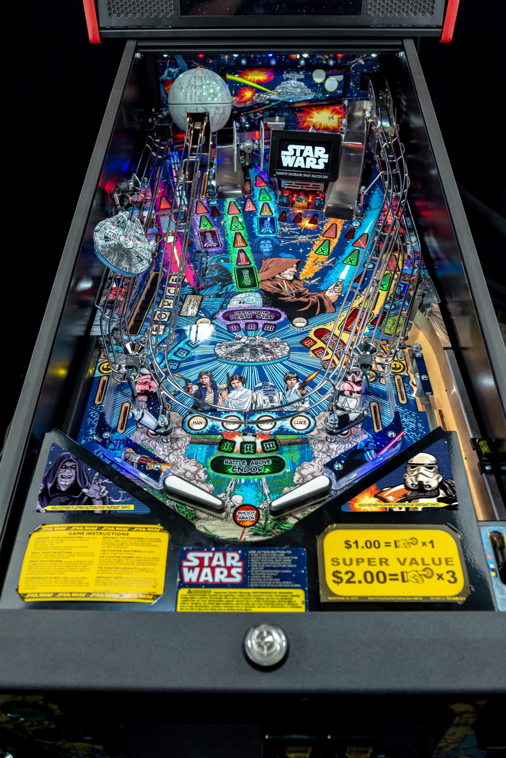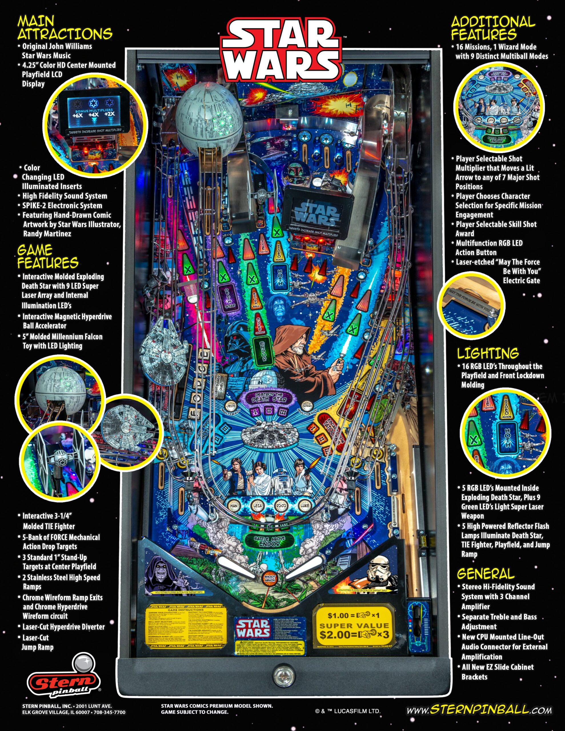 | Notable Features: | Flippers (2), Pop bumpers (2), Slingshots (3), Standup targets (9), 5-bank drop targets (1), Horseshoe lane (1), Scoop (1), Diverter (1), Right outlane ball save (see Notes). Miniature LCD screen on playfield. A slingshot is used to interact with the two pop bumpers. Chrome metal ramps and wire habitrails. A “jump ramp” raises from under the playfield to load balls into the Death Star for multiball, shooting them into a looping aerial habitrail. Nine Multiball Modes and one Wizard Mode. Action button on lockdown bar. Up to 6 balls in simultaneous play. Has speech. Color LCD backbox display. Stereo sound.