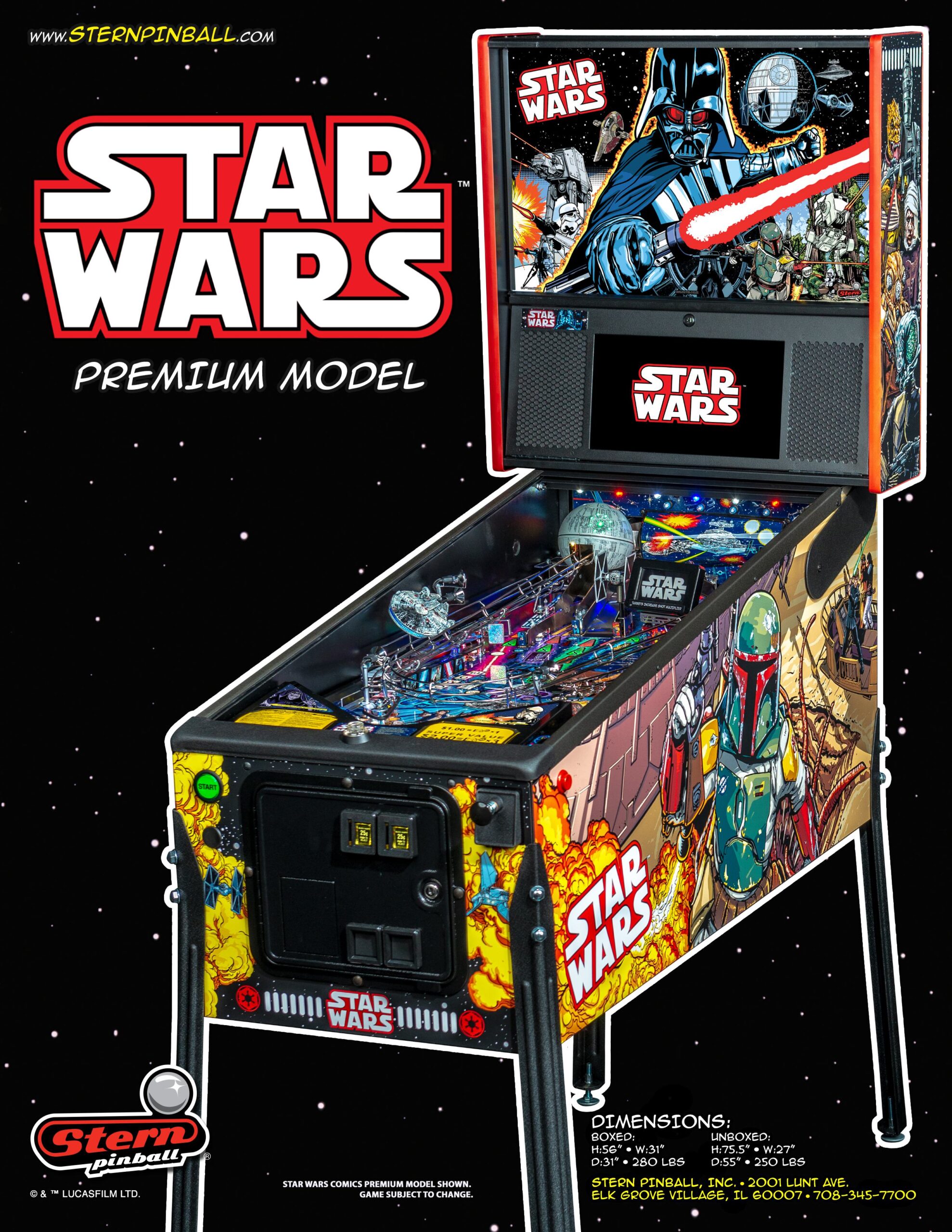 Stern’s Star Wars Comic Book Premium is a pinball machine that brings vibrant comic-style artwork and fast-paced gameplay to the classic Star Wars universe.
