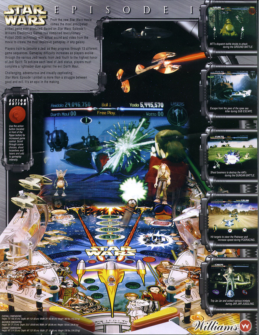 Last game manufactured by WMS industries (Williams and Bally labels) before the announcement to close their doors on October 25, 1999. The jet bumper rule of the 1.4 software reminds players of that date. (The number of points for spelling Jar Jar is 19,992,510. This is the date 25-10-1999, the same day WMS announced the closing of their pinball branch.)